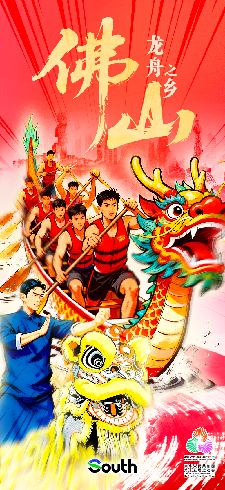 The drumbeats of the Lion Dance echo. Resonant dragon boat chants resound. Foshan is a manufacturing powerhouse, a city of kung fu, the hometown of Lion Dance, and a land of dragon boats. Every village fields its own dragon boat team. All paddle with full force, sending sprays flying. For them, it is better to crash than to fall behind. Racing forward with all might—this is the spirit of the 15th National Games.