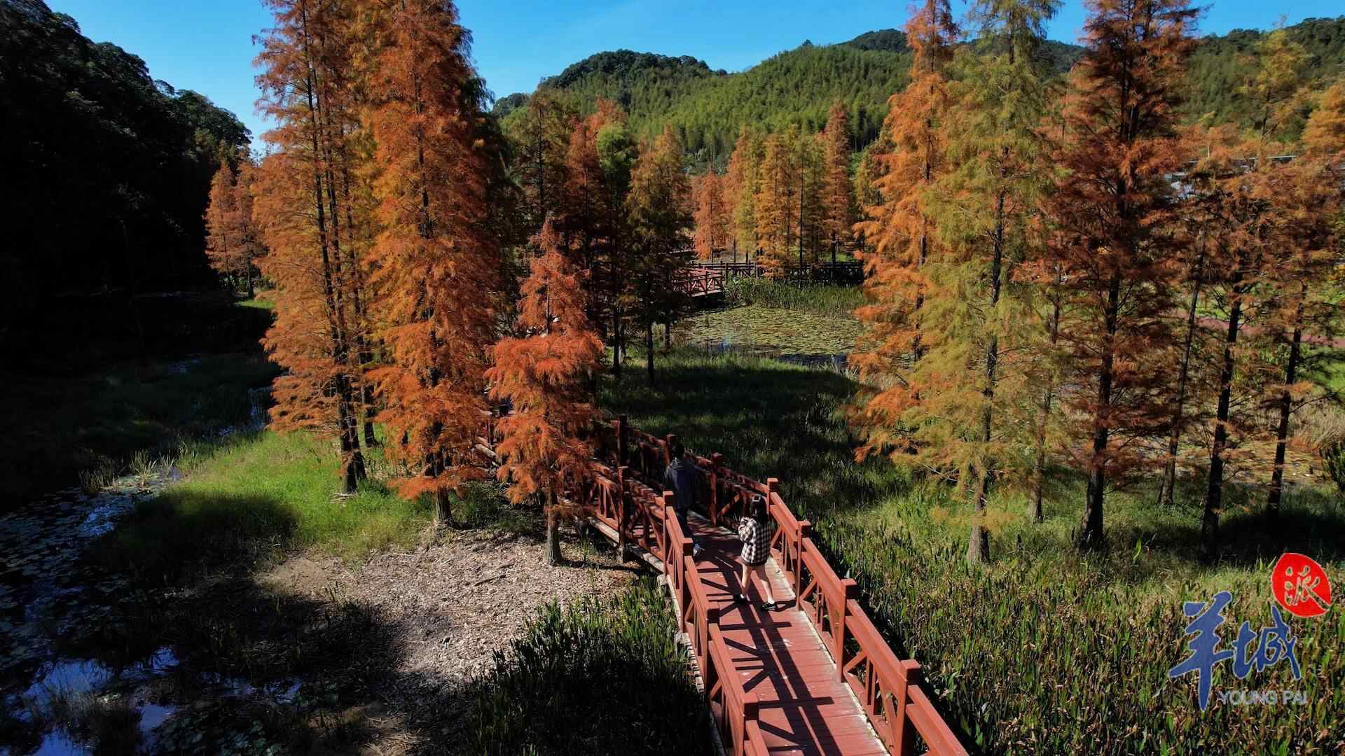 Moving from the Maple Leaf Scenic Area towards the nearby South Tianchi, one can witness several Dawn Redwoods standing along the lake, displaying shades of orange-red. The combination of Dawn Redwoods, wooden bridges, the lake, pavilions, and mountains form a unique Southern landscape for the autumn-winter season, distinct from the forested scenery of the Maple Leaf area.