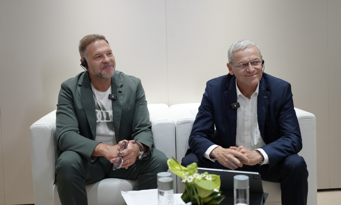 Michael Arndt, president of FAW-Audi Sales Co (left), and Helmut Stettner, CEO of Audi FAW NEV Co, give an interview in Shenzhen, Guangdong province, on May 31, 2025. [Photo provided to chinadaily.com.cn]