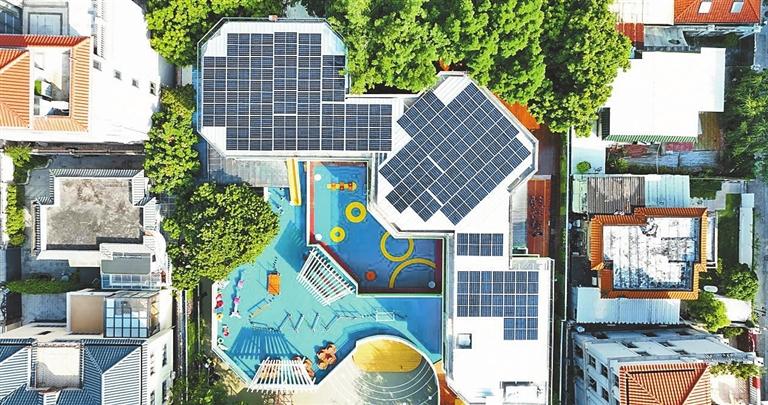 Rooftop solar installations at Luohu District's Yijing Kindergarten, a near-zero carbon campus pilot project. Daily Sunshine