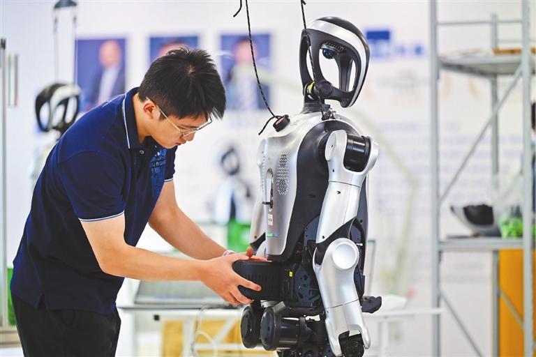 Zhang Hongwei installs a battery into a humanoid robot at Leju Robot's R&D headquarters in Hefei, on Oct. 24.