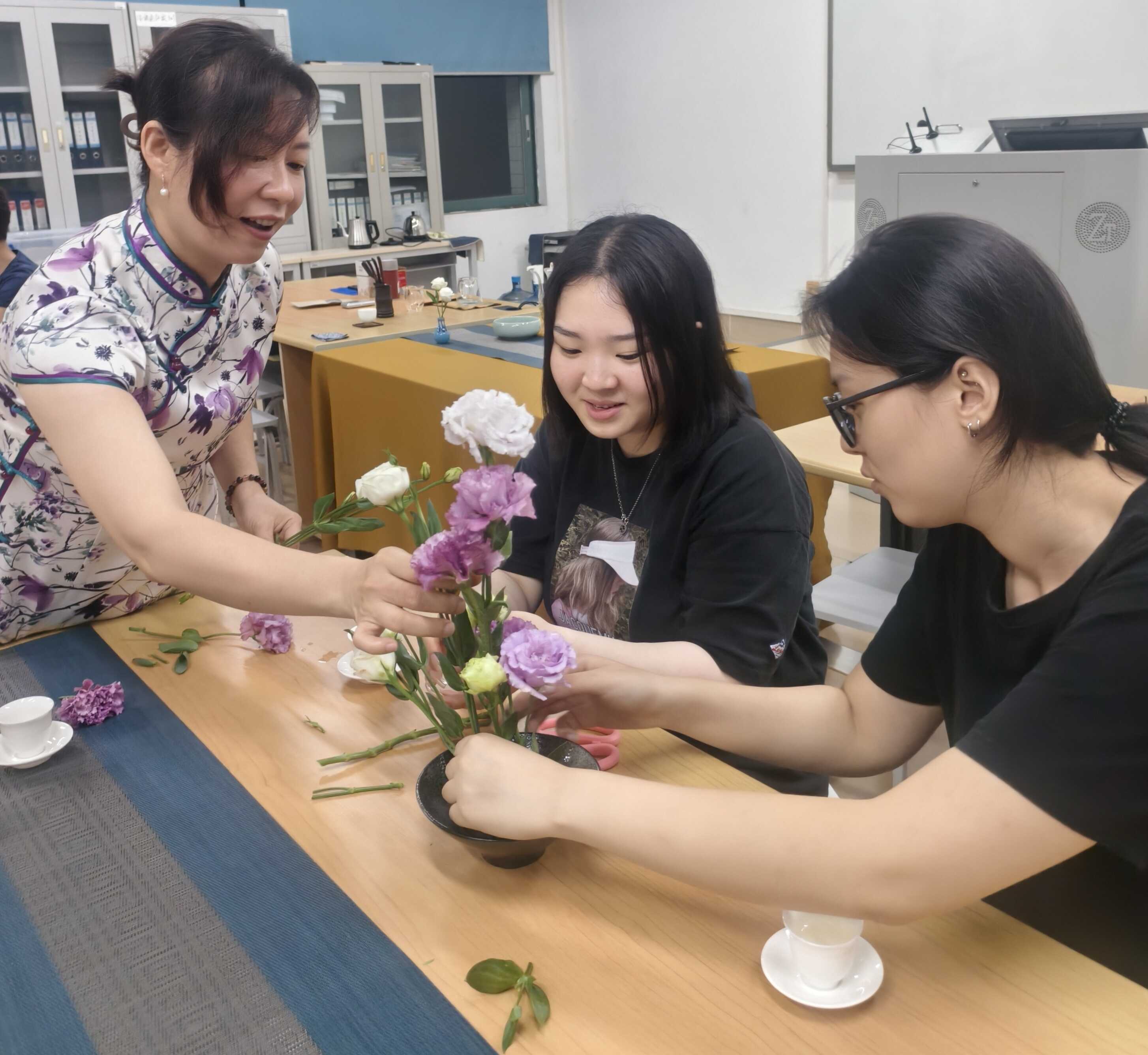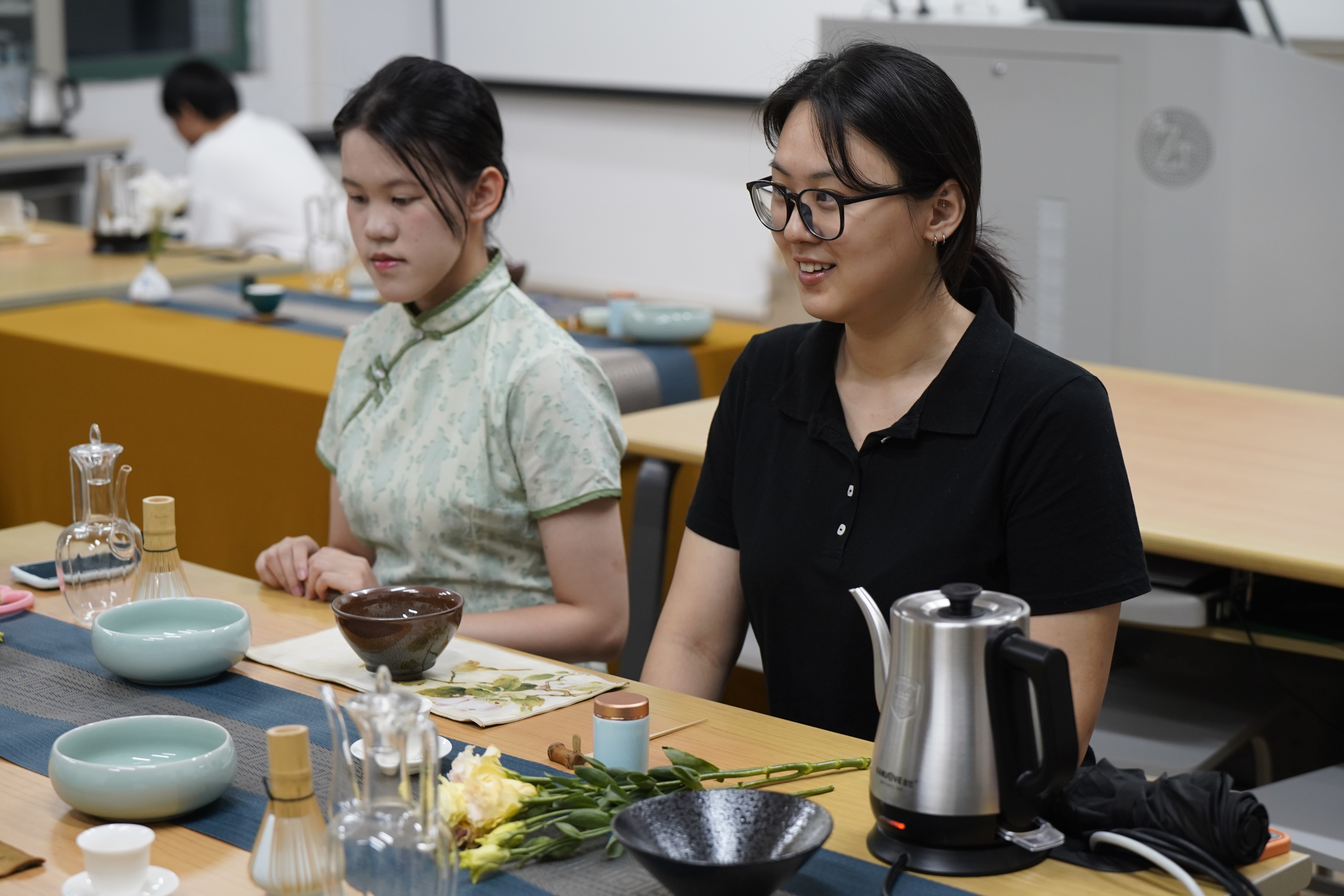 Throughout the demonstration, Teacher Cai shared her expertise, explaining how warming the utensils and wafting fragrance can enhance the aroma of the tea. She also emphasized the etiquette of pouring tea, stating "When serving wine, show respect and gratitude to guests by ensuring their drink is filled; when serving tea, do not overfill the tea cup to avoid making the guest uncomfortable," advising students to fill the cup to seventy percent to avoid scalding the drinker.