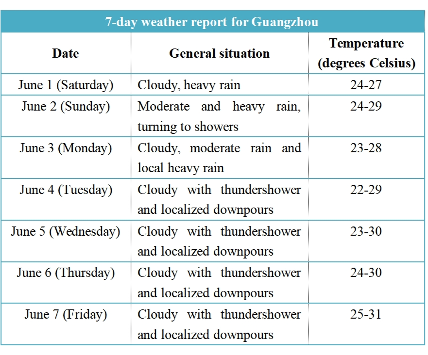 The Guangdong Meteorological Center predicted that due to the influence of the typhoon in Guangdong Province, heavy rain is expected from the morning of June 1 to 2 in cities along the west coast of Guangdong, the Pearl River Delta region, eastern Guangdong as well as Heyuan and Meizhou. The rest of the region will experience cloudy weather with intermittent heavy rainfall.