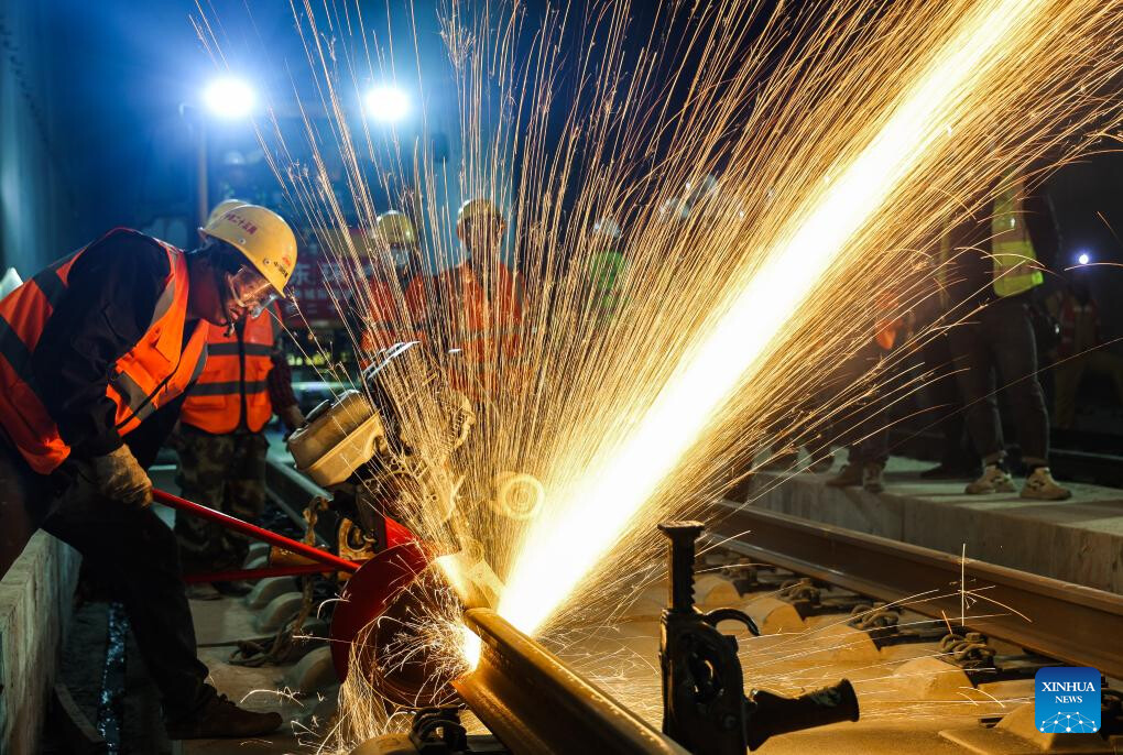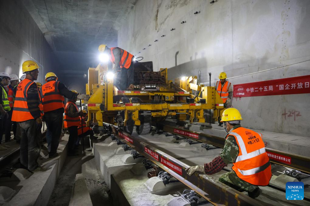 The track laying work of the Guangfo east ring intercity railway was completed on Monday. The project is a section of Guangzhou-Foshan circular intercity railway and also an important part of the intercity railway network of the Guangdong-Hong Kong-Macao Greater Bay Area. (Xinhua/Liu Dawei)