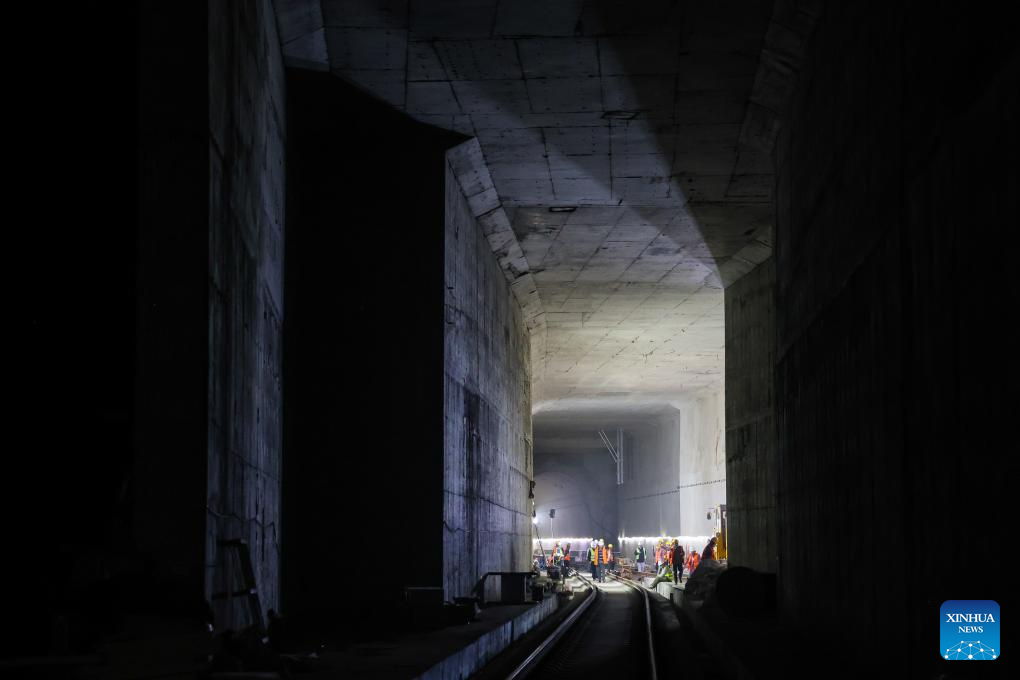 Constructors work at Dayuan Station of the Guangfo (Guangzhou-Foshan) east ring intercity railway in Guangzhou, south China's Guangdong Province, Jan. 6, 2025.