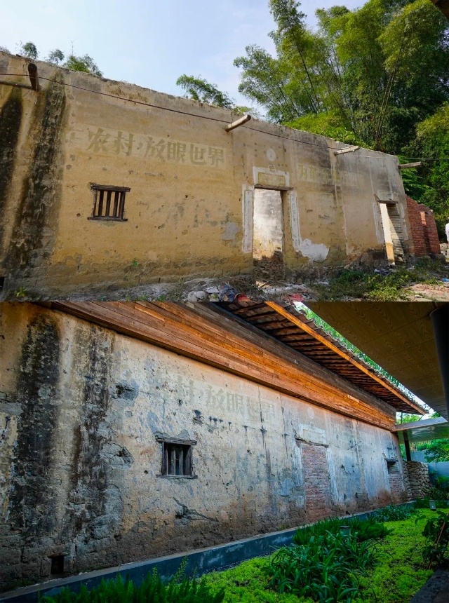 A corner in Xutian Village's old house with a wall inscription saying "Rural Villages, Set Eyes to the World."