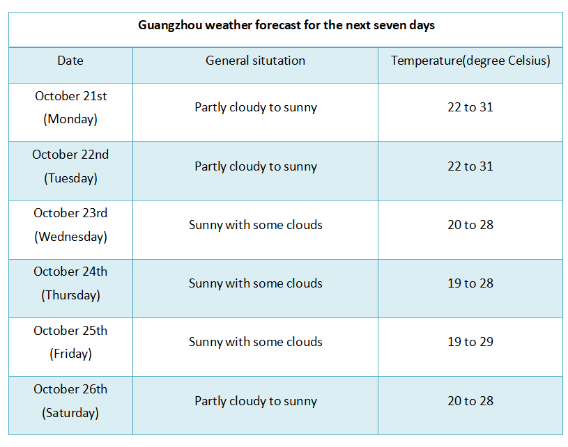The Guangzhou Meteorological Observatory forecasts that Guangzhou will be mainly cloudy to sunny in the coming two days, with slight temperature fluctuations. The maximum temperature will be around 31°C, and the minimum will be around 23°C. Although the intensity of the weak cold front is not vigorous, another one is expected to arrive in the evening to the nighttime of October 22nd.