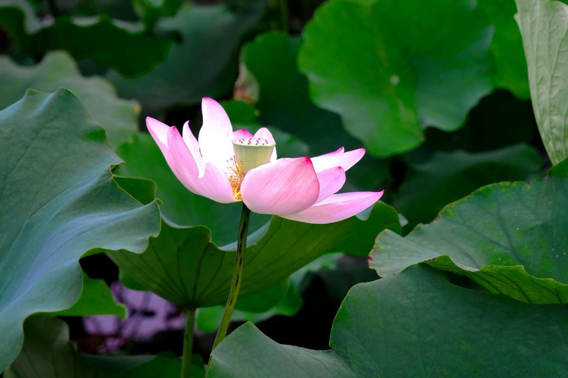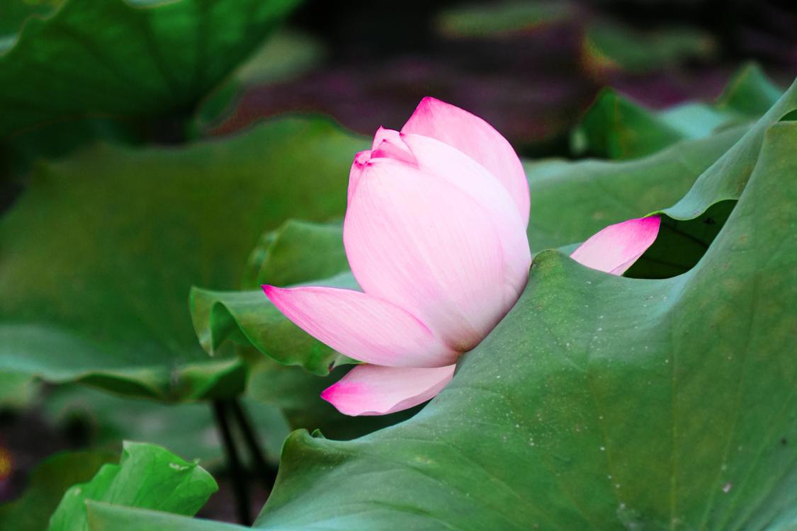A lotus flower hidden in the cluster of lotus leaves displays delicate and charming demeanor.