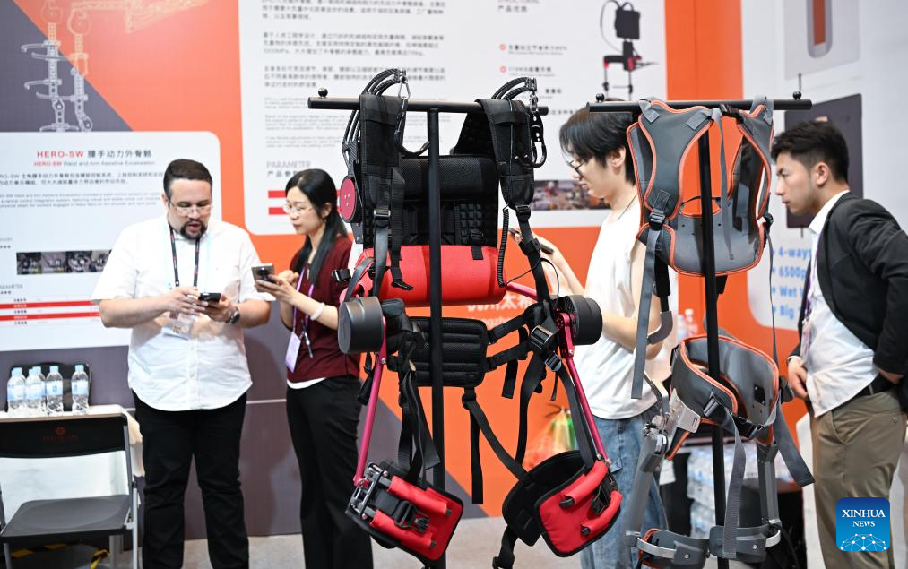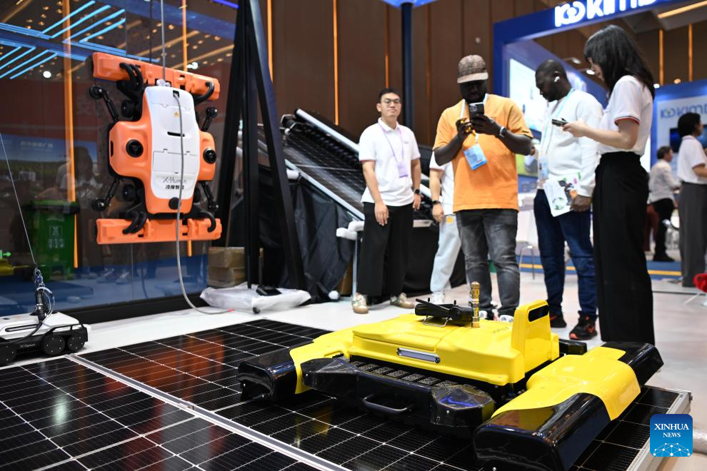 This photo taken on April 15, 2025 shows a photovoltaic panel cleaning robot and a high-altitude curtain wall cleaning robot at the Service Robots Zone during the 137th edition of the China Import and Export Fair, also known as the Canton Fair, in Guangzhou, south China's Guangdong Province. The 137th edition of the Canton Fair kicked off on Tuesday, with the number of export exhibitors exceeding 30,000 for the first time in the history of this famous event.