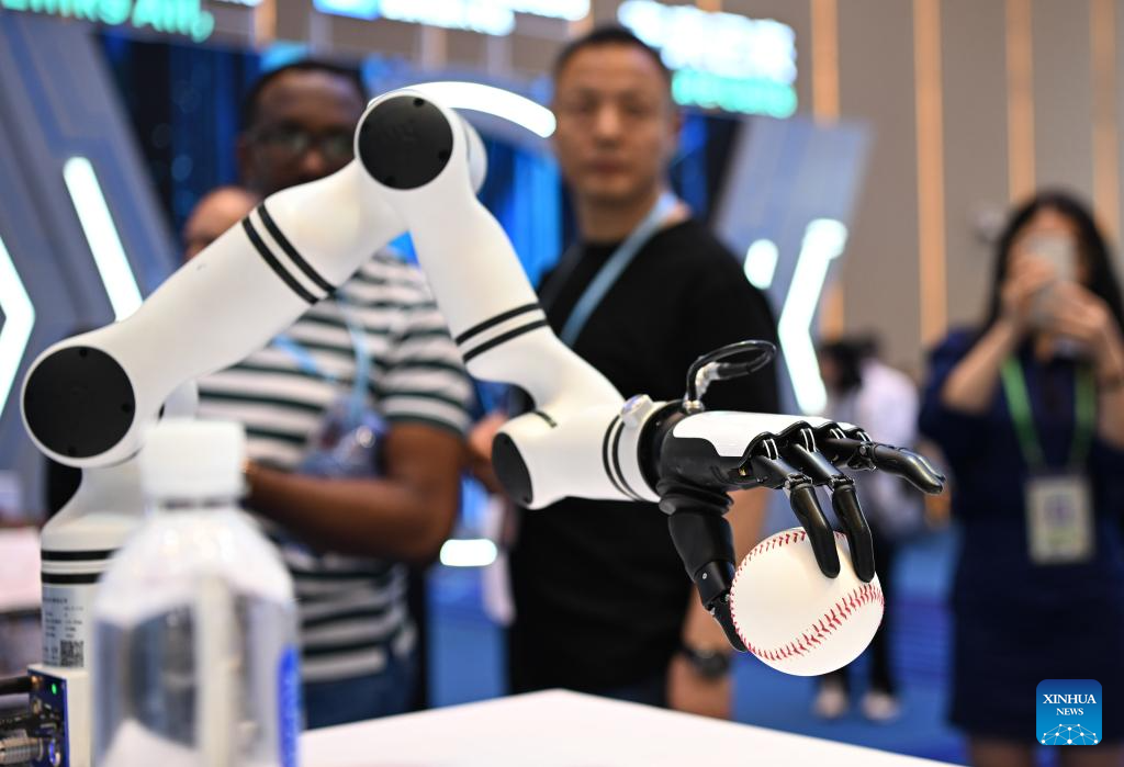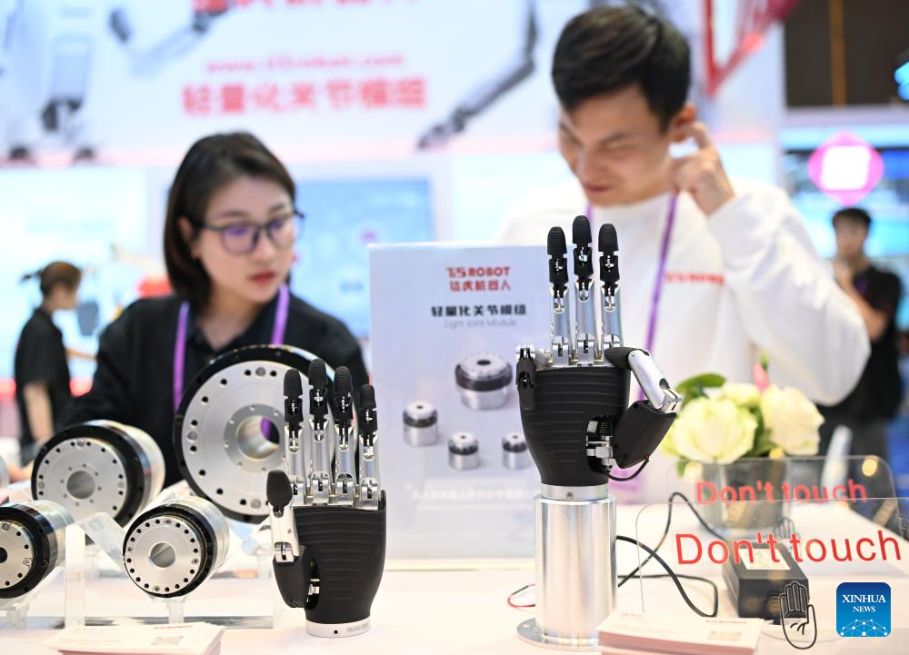 This photo taken on April 15, 2025 shows a robotic arm demonstrating dexterous hand functions at the Service Robots Zone during the 137th edition of the China Import and Export Fair, also known as the Canton Fair, in Guangzhou, south China's Guangdong Province. The 137th edition of the Canton Fair kicked off on Tuesday, with the number of export exhibitors exceeding 30,000 for the first time in the history of this famous event.
