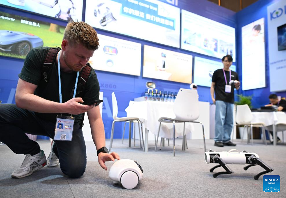 A foreign buyer watches a pet robot and an educational robot at the Service Robots Zone during the 137th edition of the China Import and Export Fair, also known as the Canton Fair, in Guangzhou, south China's Guangdong Province, April 15, 2025. The 137th edition of the Canton Fair kicked off on Tuesday, with the number of export exhibitors exceeding 30,000 for the first time in the history of this famous event.