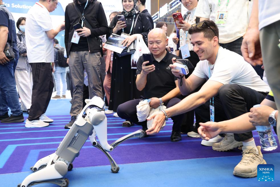 Foreign buyers interact with a robot dog at the Service Robots Zone during the 137th edition of the China Import and Export Fair, also known as the Canton Fair, in Guangzhou, south China's Guangdong Province, April 15, 2025. The 137th edition of the Canton Fair kicked off on Tuesday, with the number of export exhibitors exceeding 30,000 for the first time in the history of this famous event.