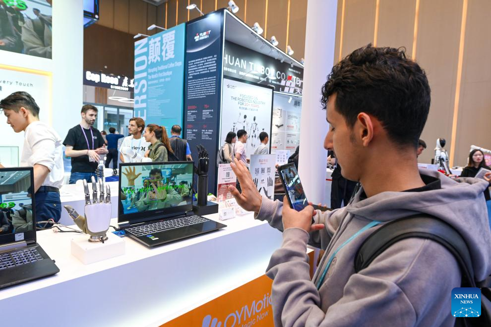 A foreign buyer tries gesture control technology at the Service Robots Zone during the 137th edition of the China Import and Export Fair, also known as the Canton Fair, in Guangzhou, south China's Guangdong Province, April 15, 2025. The 137th edition of the Canton Fair kicked off on Tuesday, with the number of export exhibitors exceeding 30,000 for the first time in the history of this famous event.