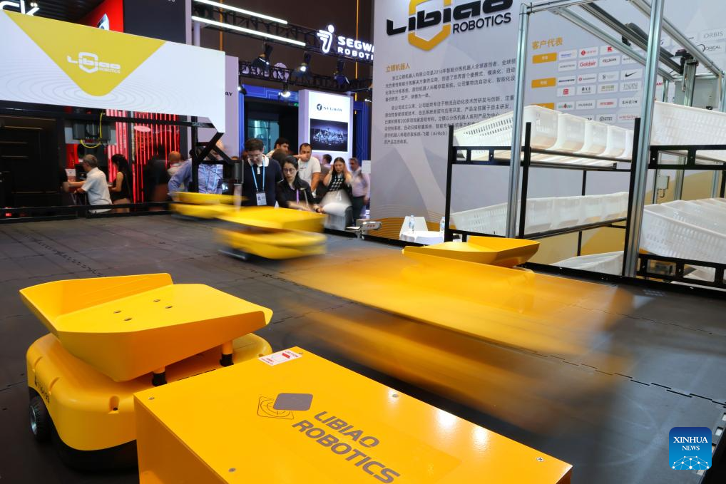 People watch the demonstrations of intelligent sorting robots at the Service Robots Zone during the 137th edition of the China Import and Export Fair, also known as the Canton Fair, in Guangzhou, south China's Guangdong Province, April 15, 2025. The 137th edition of the Canton Fair kicked off on Tuesday, with the number of export exhibitors exceeding 30,000 for the first time in the history of this famous event.