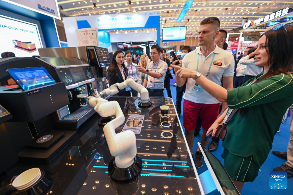 The first phase of the Canton Fair, held from April 15 to 19, focuses on advanced manufacturing and for the first time added a special zone for service robots, showcasing the latest achievements of China's AI development efforts. (Xinhua/Lu Hanxin)