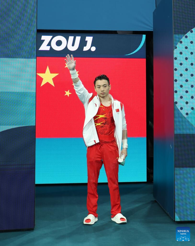 Zou Jingyuan of China reacts before the men's rings final of artistic gymnastics at the Paris 2024 Olympic Games in Paris, France, Aug. 4, 2024. (Xinhua/Cao Can)