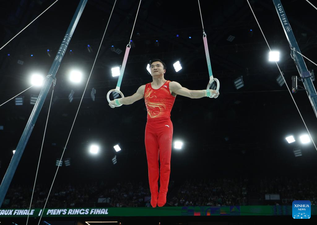 Liu Yang of China competes during the men's rings final of artistic gymnastics at the Paris 2024 Olympic Games in Paris, France, Aug. 4, 2024. (Xinhua/Cao Can)