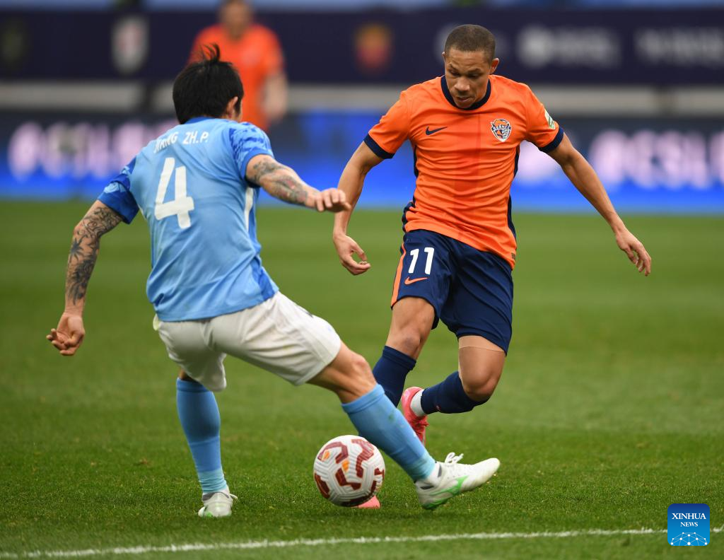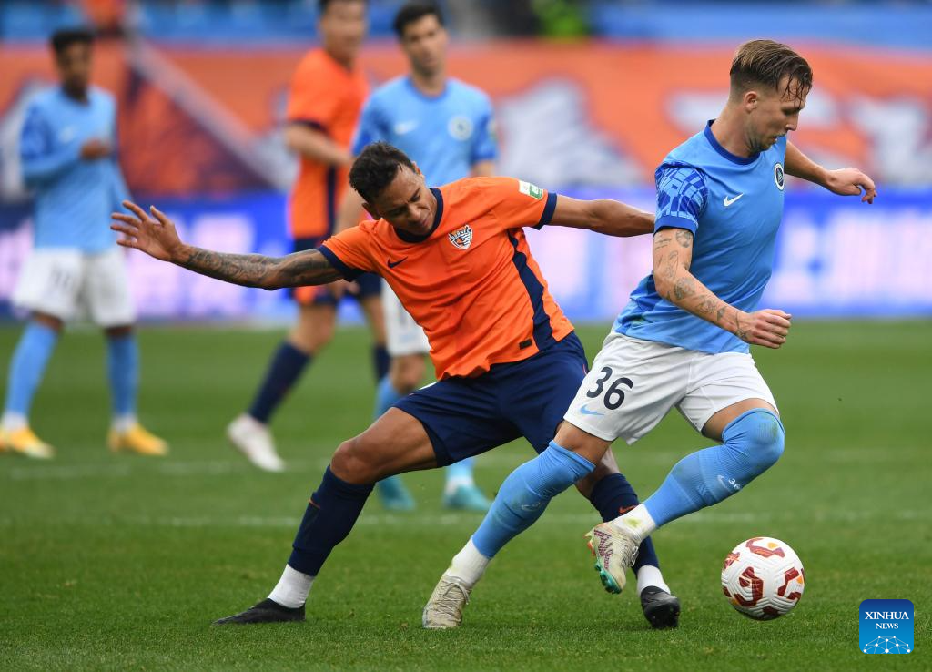 Filipe Augusto (L) of Qingdao Hainiu vies with Eden Karzev of Shenzhen Peng City during the 2nd round match between Shenzhen Peng City and Qingdao Hainiu at the 2025 Chinese Super League (CSL) in Qingdao, east China's Shandong Province, March 1, 2025. (Xinhua/Li Ziheng)