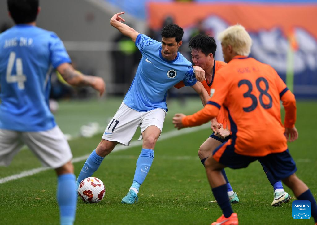 Edu Garcia (2nd L) of Shenzhen Peng City competes during the 2nd round match between Shenzhen Peng City and Qingdao Hainiu at the 2025 Chinese Super League (CSL) in Qingdao, east China's Shandong Province, March 1, 2025. (Xinhua/Li Ziheng)