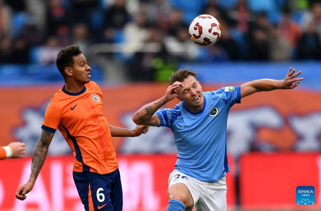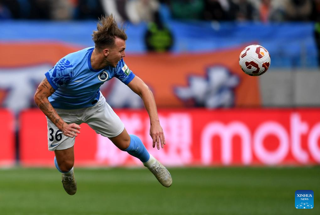 Eden Karzev of Shenzhen Peng City heads the ball during the 2nd round match between Shenzhen Peng City and Qingdao Hainiu at the 2025 Chinese Super League (CSL) in Qingdao, east China's Shandong Province, March 1, 2025. (Xinhua/Li Ziheng)