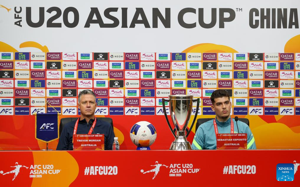 Australia's head coach Trevor Morgan (L) and player Sebastian Esposito attend a press conference before the AFC U20 Asian Cup football tournament final match between Australia and Saudi Arabia in Shenzhen, south China's Guangdong Province, Feb. 28, 2025. (Xinhua/Li Xulun)