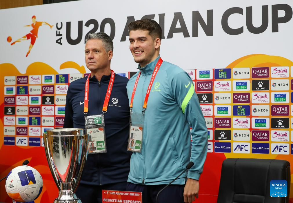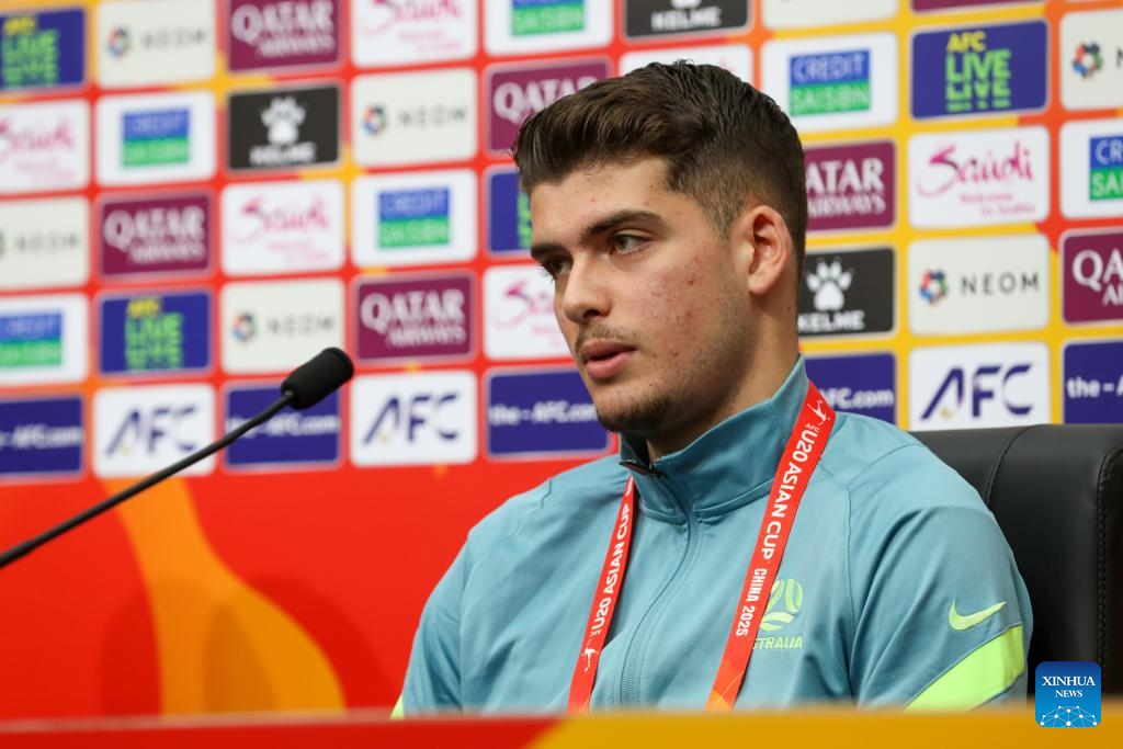 Australia's player Sebastian Esposito attends a press conference before the AFC U20 Asian Cup football tournament final match between Australia and Saudi Arabia in Shenzhen, south China's Guangdong Province, Feb. 28, 2025. (Xinhua/Li Xulun)