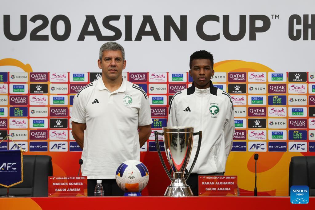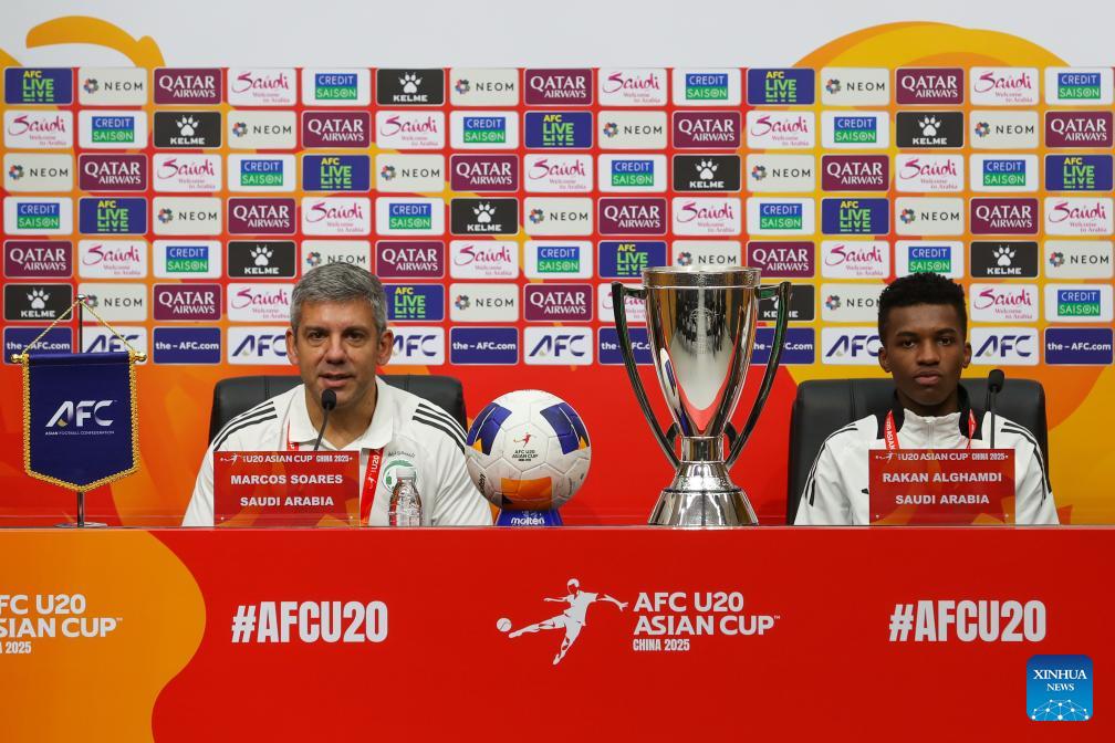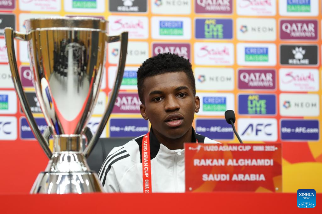 Saudi Arabia's player Rakan Khalid Alghamdi attends a press conference before the AFC U20 Asian Cup football tournament final match between Australia and Saudi Arabia in Shenzhen, south China's Guangdong Province, Feb. 28, 2025. (Xinhua/Li Xulun)