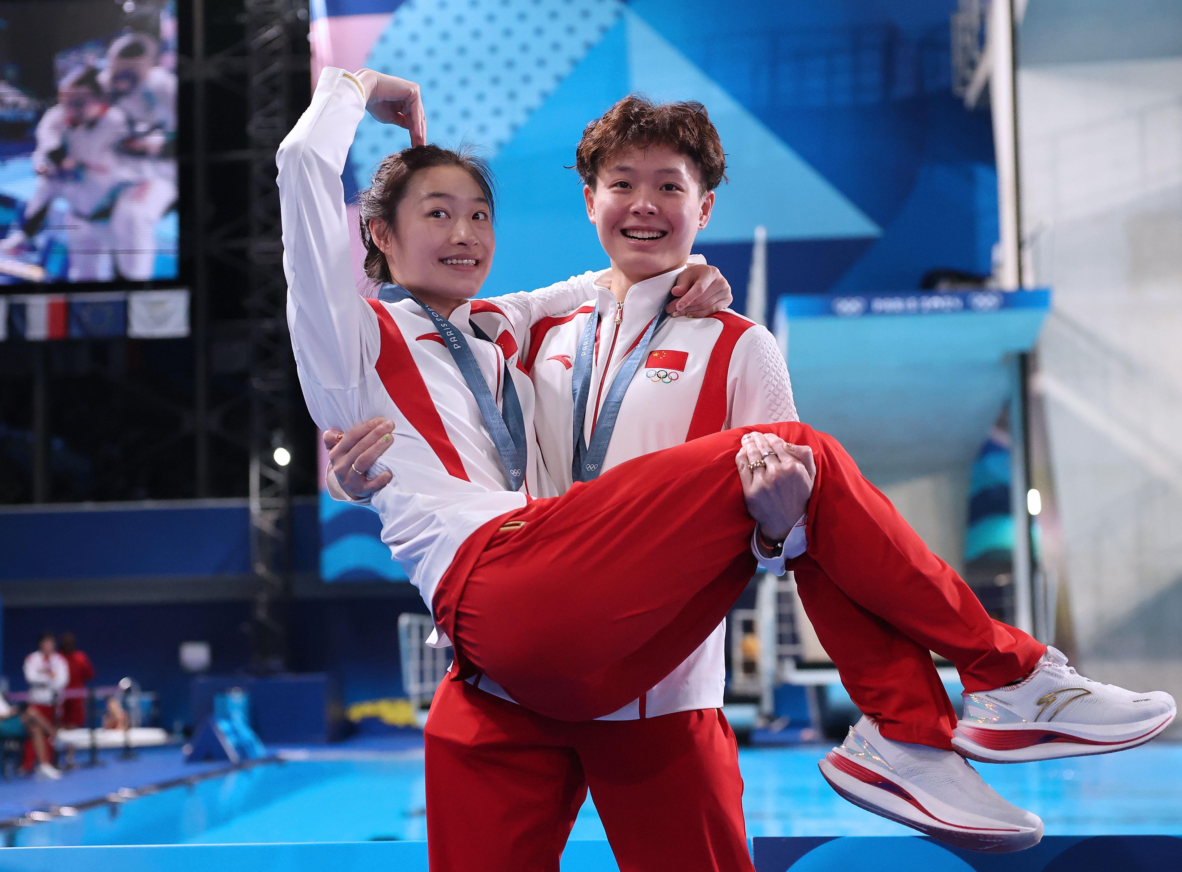 Newcomers to the Olympics, Chen Yiwen and Chang Ya'ni, won the championship in the women's synchronised 3m springboard event . After that, Chen Yiwen carried Chang Ya'ni in her arms . This infectious scene left international competitors in awe, but they soon joined in the celebration. The runners-up and the third-place teams also hoisted their partners on their backs, turning the podium into a stage of joy, making it the highlight of the day.
