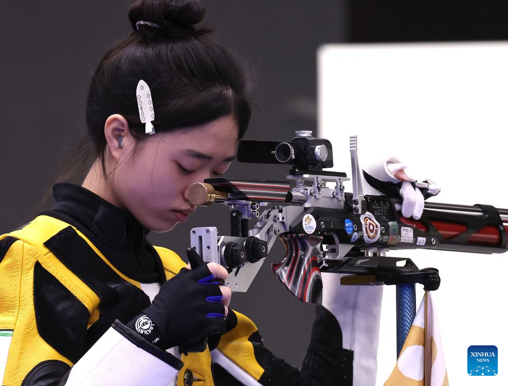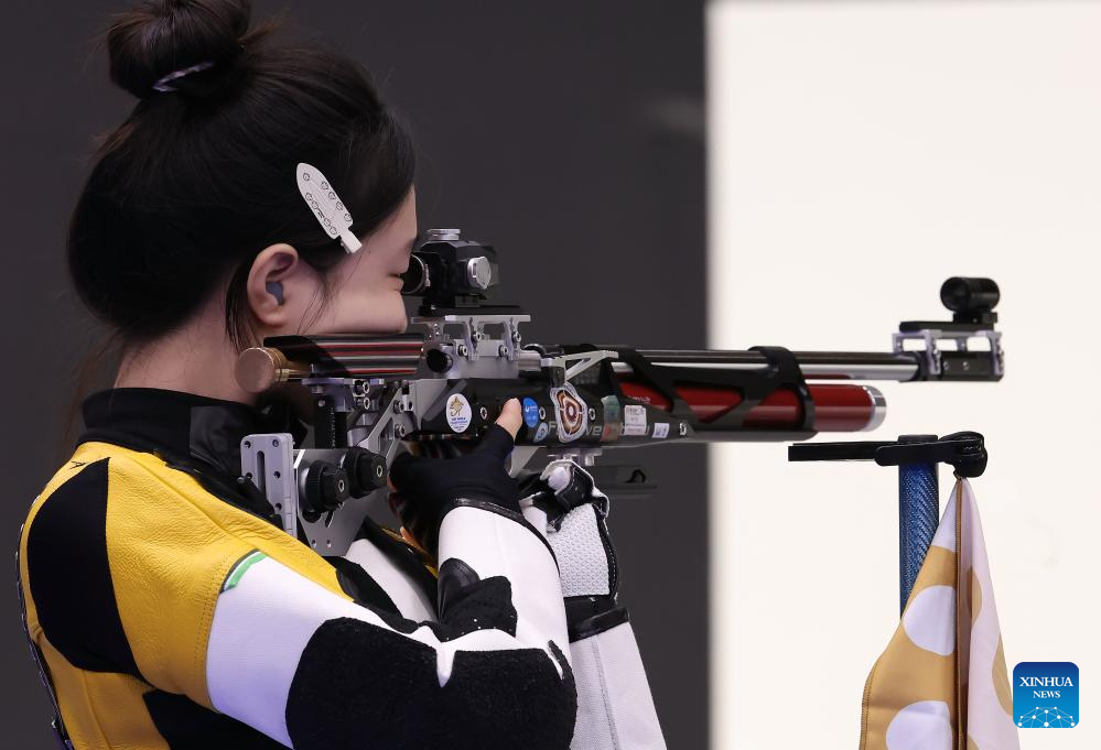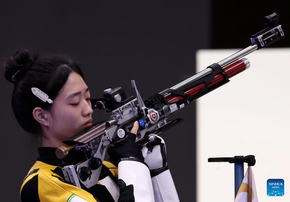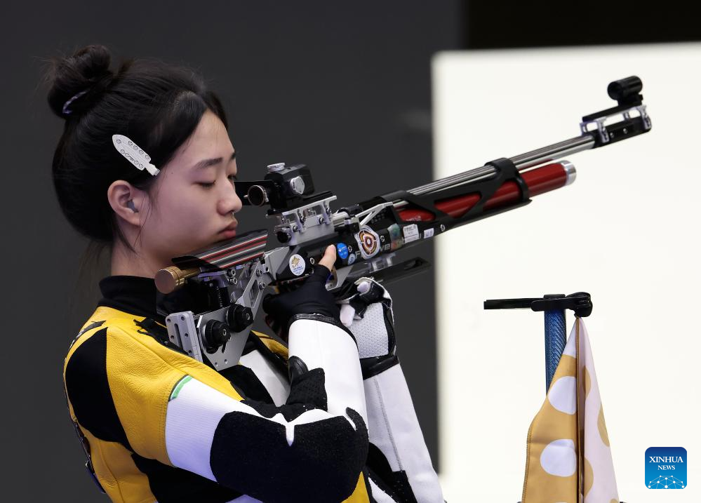 Huang Yuting of China competes during the 10m air rifle mixed team gold medal match of shooting between China and South Korea at the Paris 2024 Olympic Games in Chateauroux, France, on July 27, 2024. (Xinhua/Zhang Fan)