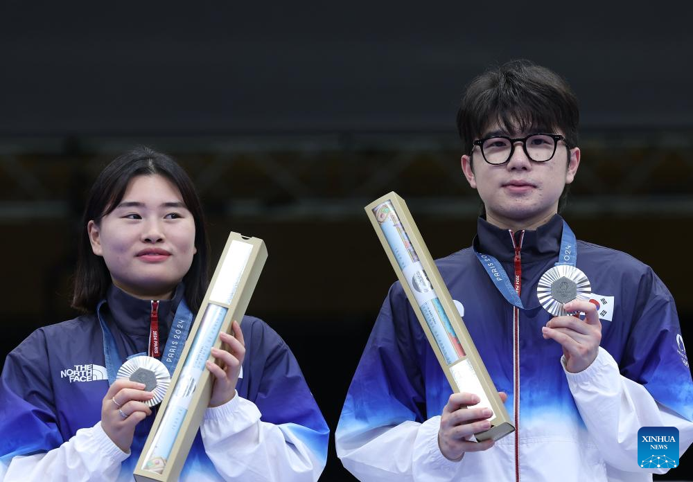 Silver medalists Keum Jihyeon (L)/Park Hajun of South Korea are seen during the awarding ceremony after the 10m air rifle mixed team gold medal match of shooting at the Paris 2024 Olympic Games in Chateauroux, France, on July 27, 2024. (Xinhua/Zhao Dingzhe)