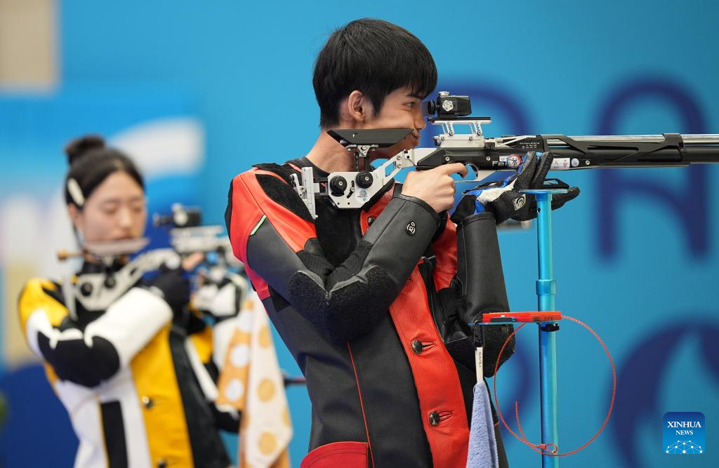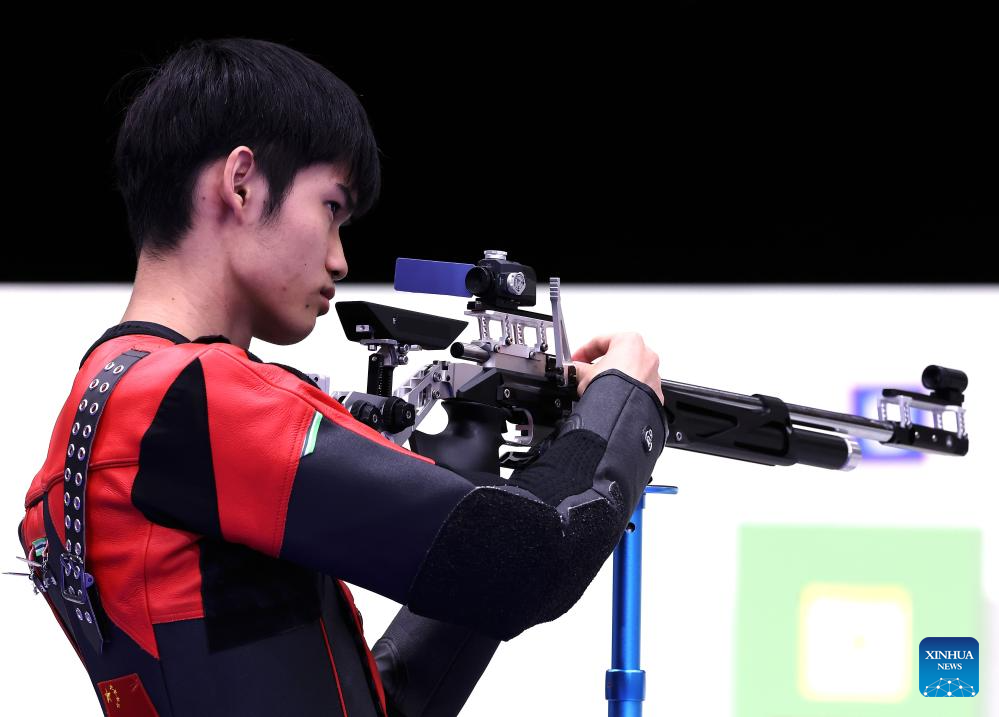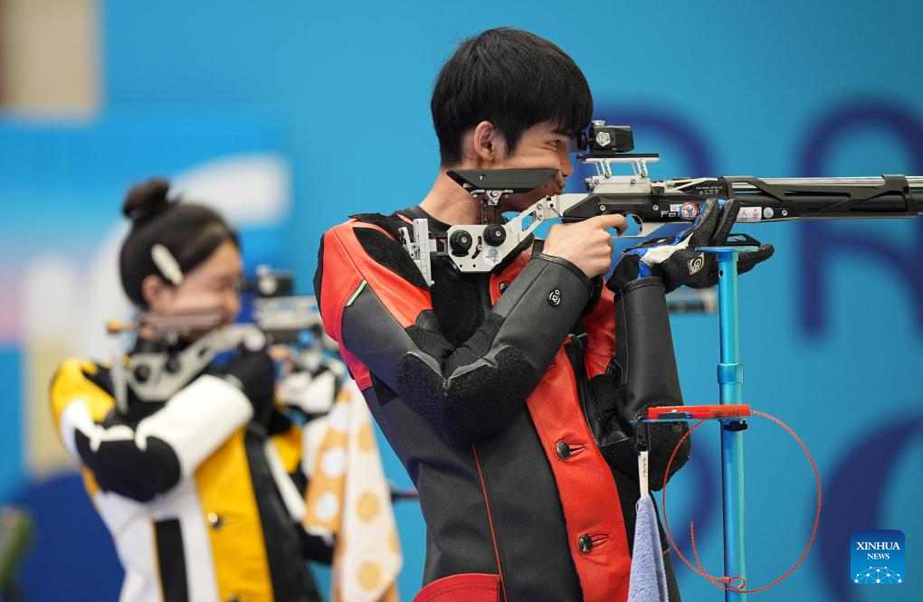 Sheng Lihao of China competes during the 10m air rifle mixed team gold medal match of shooting between China and South Korea at the Paris 2024 Olympic Games in Chateauroux, France, on July 27, 2024. (Xinhua/Zhang Fan)