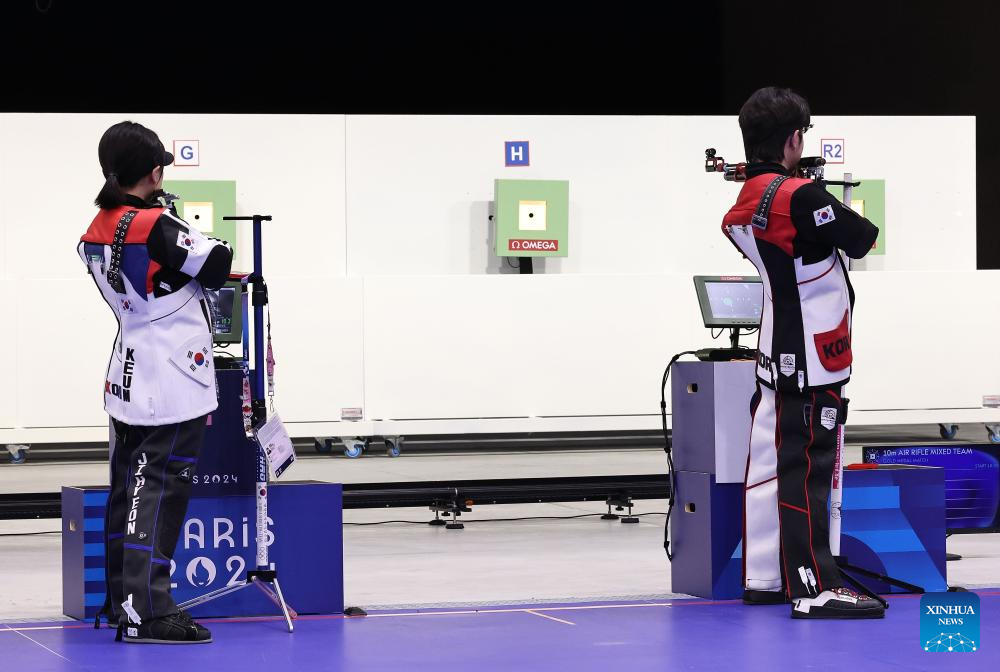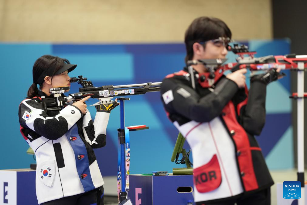 Keum Jihyeon (L)/Park Hajun of South Korea compete during the 10m air rifle mixed team gold medal match of shooting between China and South Korea at the Paris 2024 Olympic Games in Chateauroux, France, on July 27, 2024. (Xinhua/Zhang Fan)