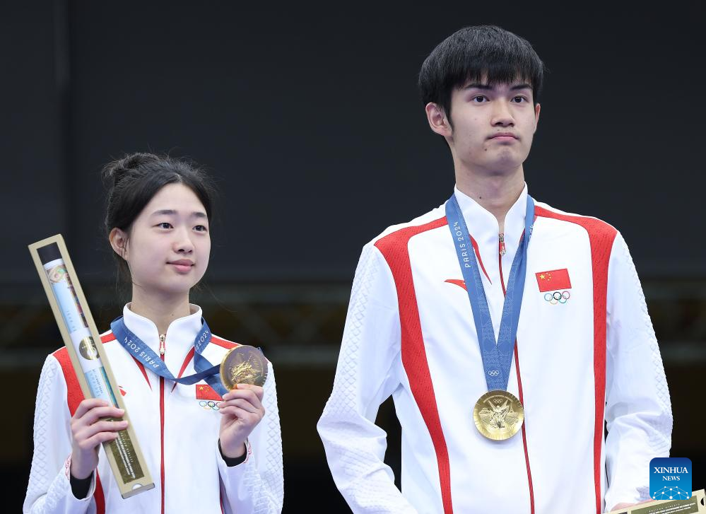 Gold medalists Huang Yuting (L)/Sheng Lihao of China are seen during the awarding ceremony after the 10m air rifle mixed team gold medal match of shooting at the Paris 2024 Olympic Games in Chateauroux, France, on July 27, 2024. (Xinhua/Zhao Dingzhe)