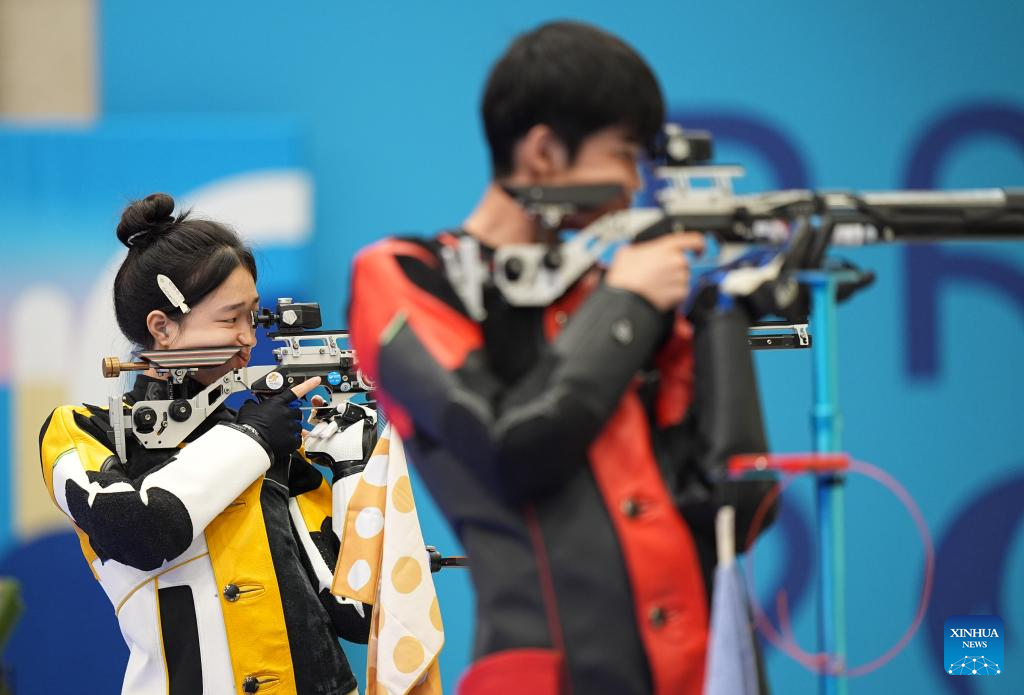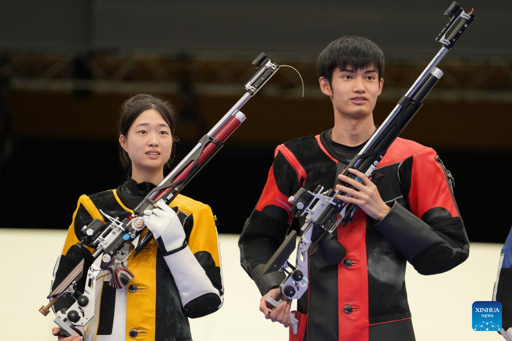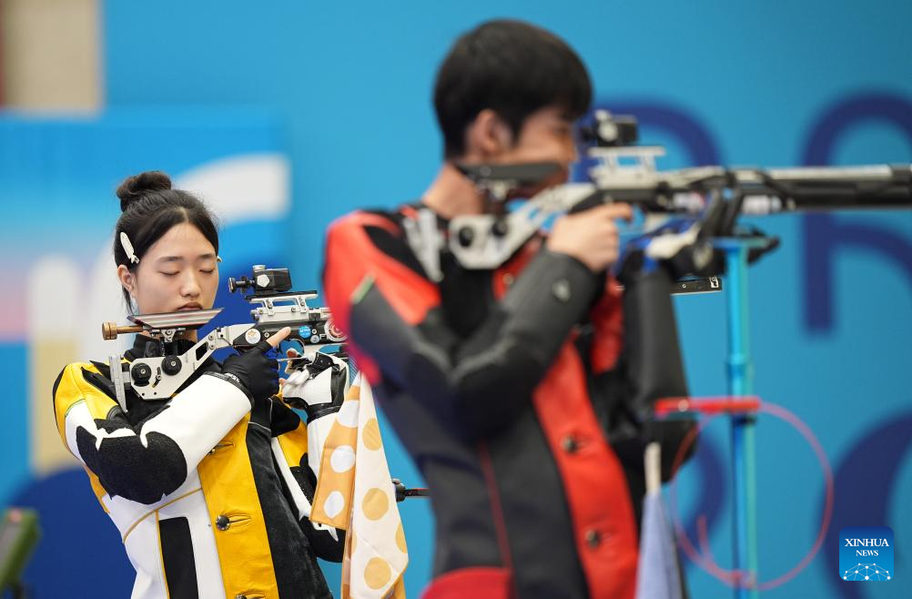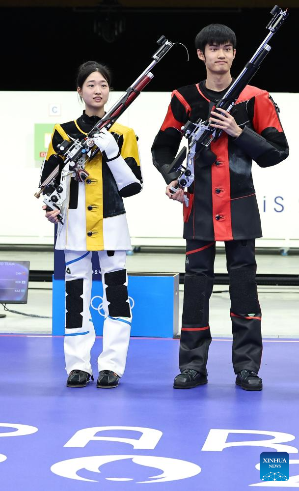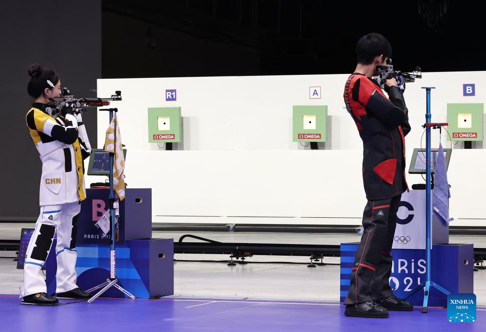 Huang Yuting (L)/Sheng Lihao of China compete during the 10m air rifle mixed team gold medal match of shooting between China and South Korea at the Paris 2024 Olympic Games in Chateauroux, France, on July 27, 2024. (Xinhua/Zhang Fan)