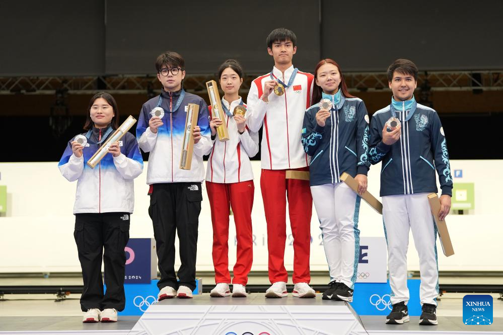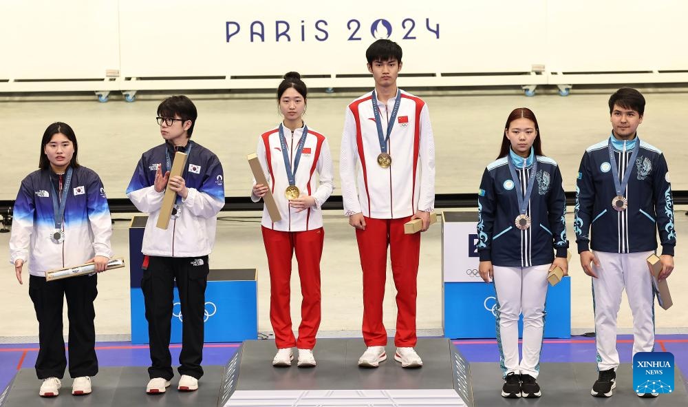 Silver medalists Keum Jihyeon/Park Hajun of South Korea, gold medalists Huang Yuting/Sheng Lihao of China and bronze medalists Alexandra Le/Islam Satpayev of Kazakhstan (L to R) pose for photos during the awarding ceremony after the 10m air rifle mixed team gold medal match of shooting at the Paris 2024 Olympic Games in Chateauroux, France, on July 27, 2024. (Xinhua/Zhang Fan)