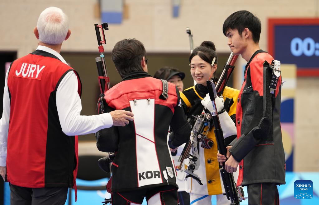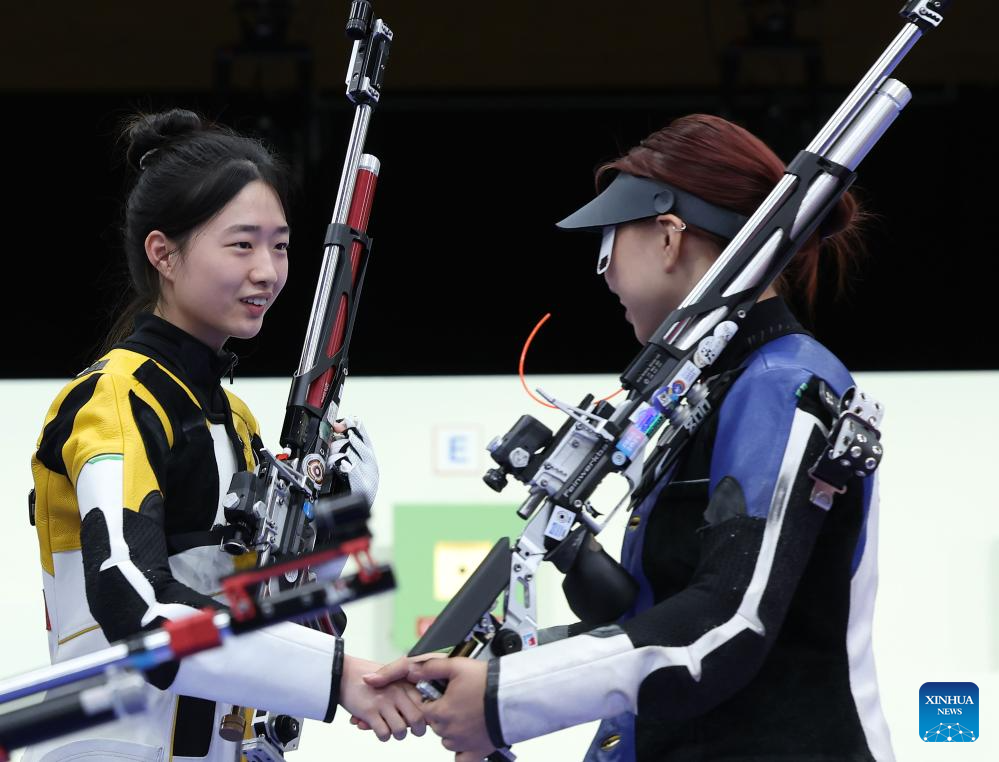 Huang Yuting (L) of China shakes hands with Keum Jihyeon of South Korea after winning the 10m air rifle mixed team gold medal match of shooting between China and South Korea at the Paris 2024 Olympic Games in Chateauroux, France, on July 27, 2024. (Xinhua/Zhao Dingzhe)