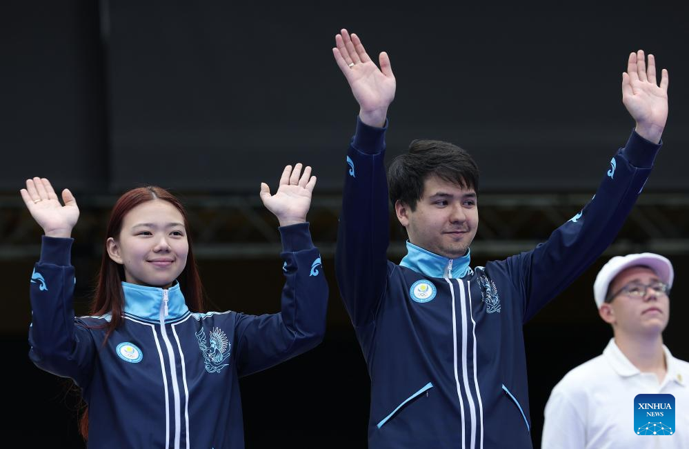 Bronze medalists Alexandra Le (1st L)/Islam Satpayev of Kazakhstan react during the awarding ceremony after the 10m air rifle mixed team gold medal match of shooting at the Paris 2024 Olympic Games in Chateauroux, France, on July 27, 2024. (Xinhua/Zhao Dingzhe)