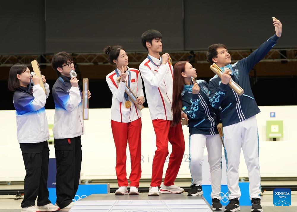 Keum Jihyeon/Park Hajun of South Korea, Huang Yuting/Sheng Lihao of China and Alexandra Le/Islam Satpayev of Kazakhstan (L to R) take selfies during the awarding ceremony after the 10m air rifle mixed team gold medal match of shooting at the Paris 2024 Olympic Games in Chateauroux, France, on July 27, 2024. (Xinhua/Ju Huanzong)