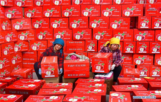 Farmers of a fruit cooperative carry apples that are ready to be exported in Zhongzhuang Town of Yiyuan County, east China's Shandong Province, Jan. 4, 2018. More than a thousand tonnes of apples were ready to be exported to Thailand, Indonesia and other countries. (Xinhua/Zhao Dongshan)