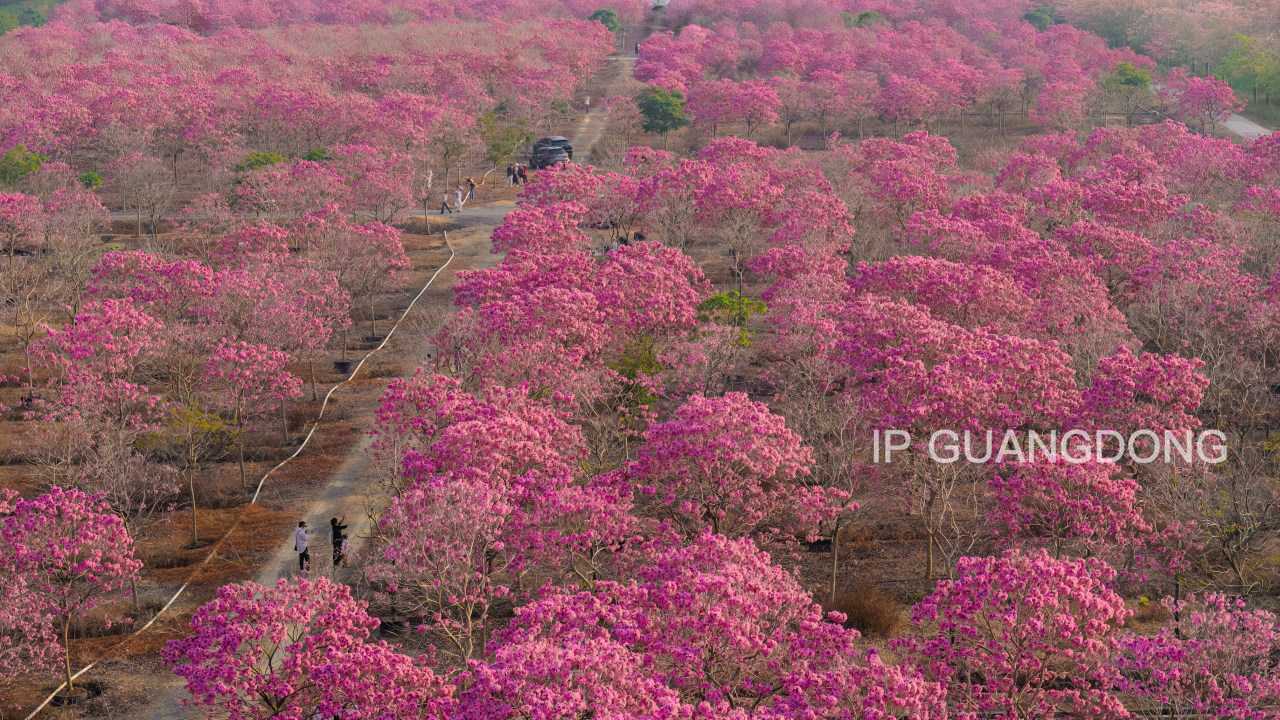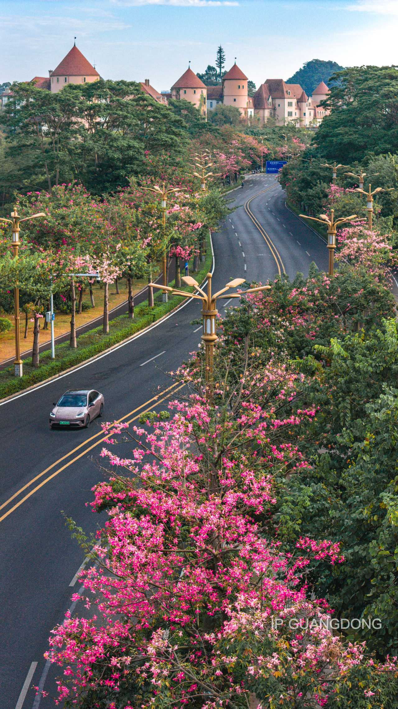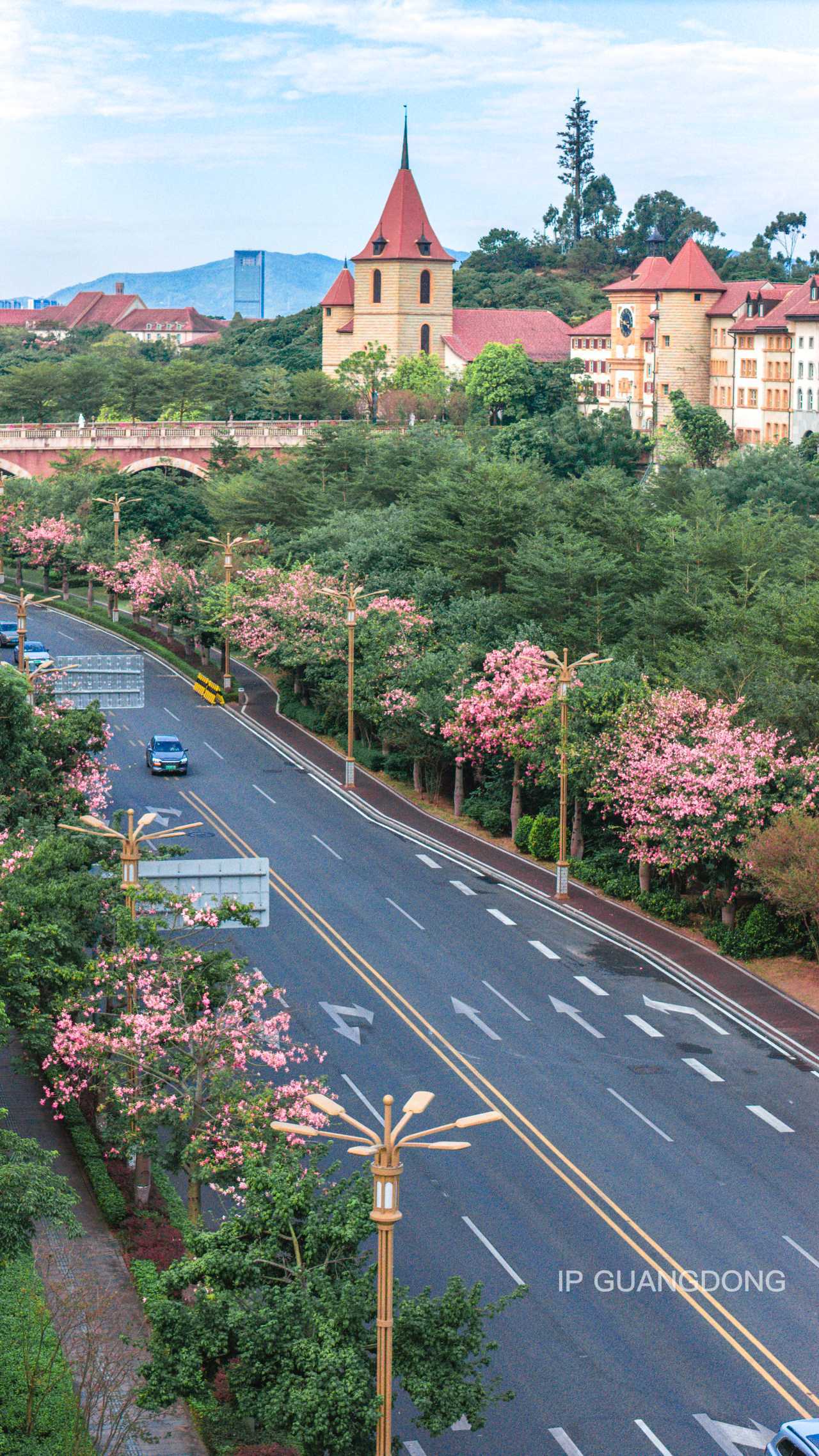 Captured by the cameras of IP Guangdong creators, the silk floss trees are in full bloom on their branches. As a light breeze blows, a shower of pink "petal snow" arrives as scheduled.