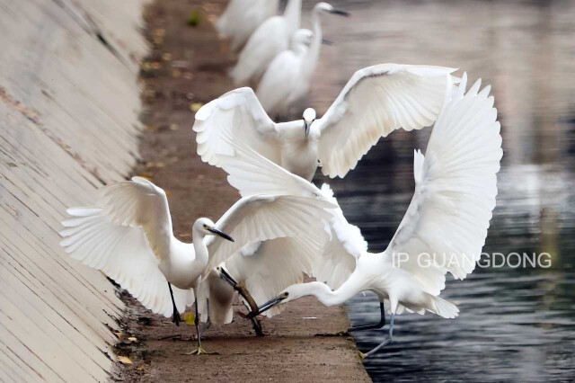 The little egret dances nimbly and gracefully by the water's edge, playing and competing for food with its companions.