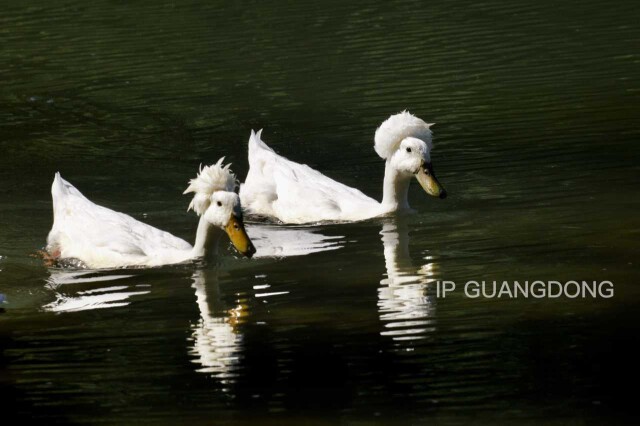 The crested white duck's fluffy white plumage resembles soft clouds, with its round body swaying gently on the water, looking utterly adorable.