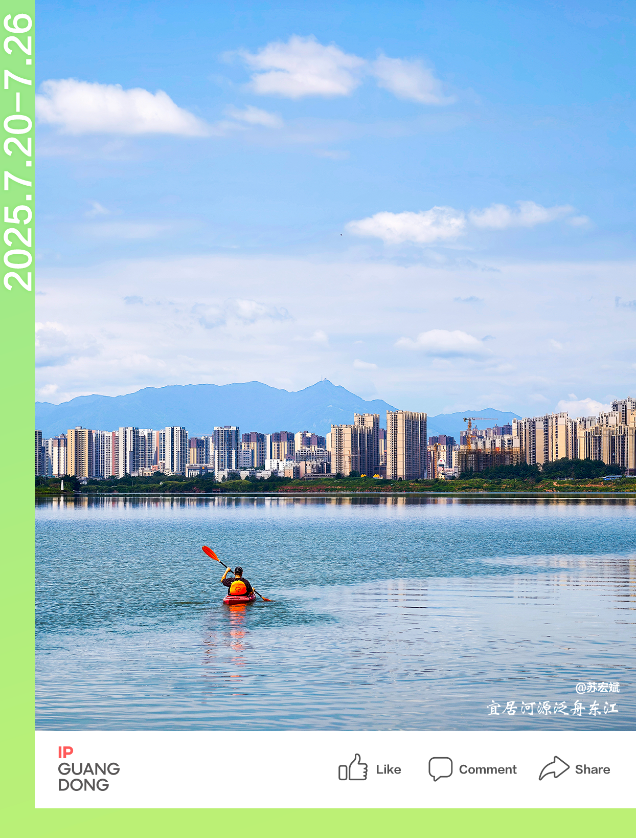 Through the lens of photographer @Su Hongbin, let's take a look at Heyuan's summer. Rolling mountains lie under a cloud-dotted sky while the Dongjiang River stretches out like a crystal-clear mirror. High-rise buildings lining the riverbank blend harmoniously with the blue sky and water, creating a picturesque scene of a livable city. A paddleboard glides gently, sending ripples across the water and adding a touch of vitality to the view.