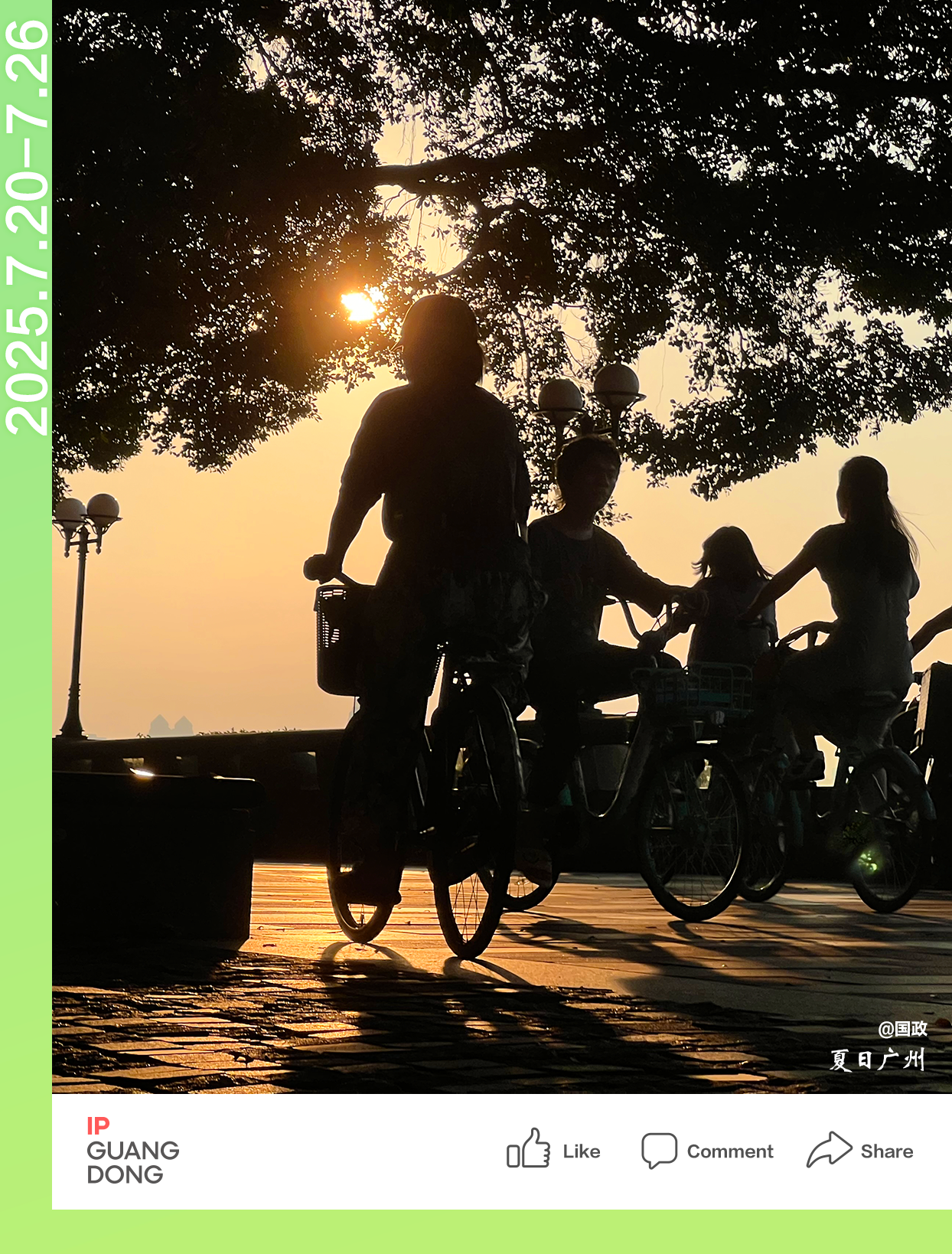 The setting sun casts slanting rays of light, filtering through trees and casting shadows along the banks of the Pearl River in Guangzhou. Photographer @Guo Zheng captures the silhouettes of cyclists passing by, sketching a tranquil summer evening.