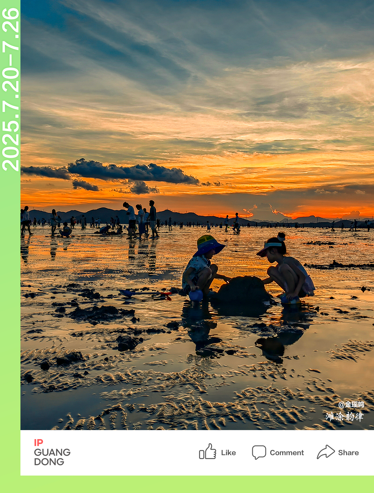 As the tide recedes at dusk, the mudflats reflect the evening sky like a mirror. On Hengshiji Beach in Zhuhai, photographer @Jin Yaoming captures two children playing gleefully in the silt—their laughter and splashing waves igniting the summer twilight.