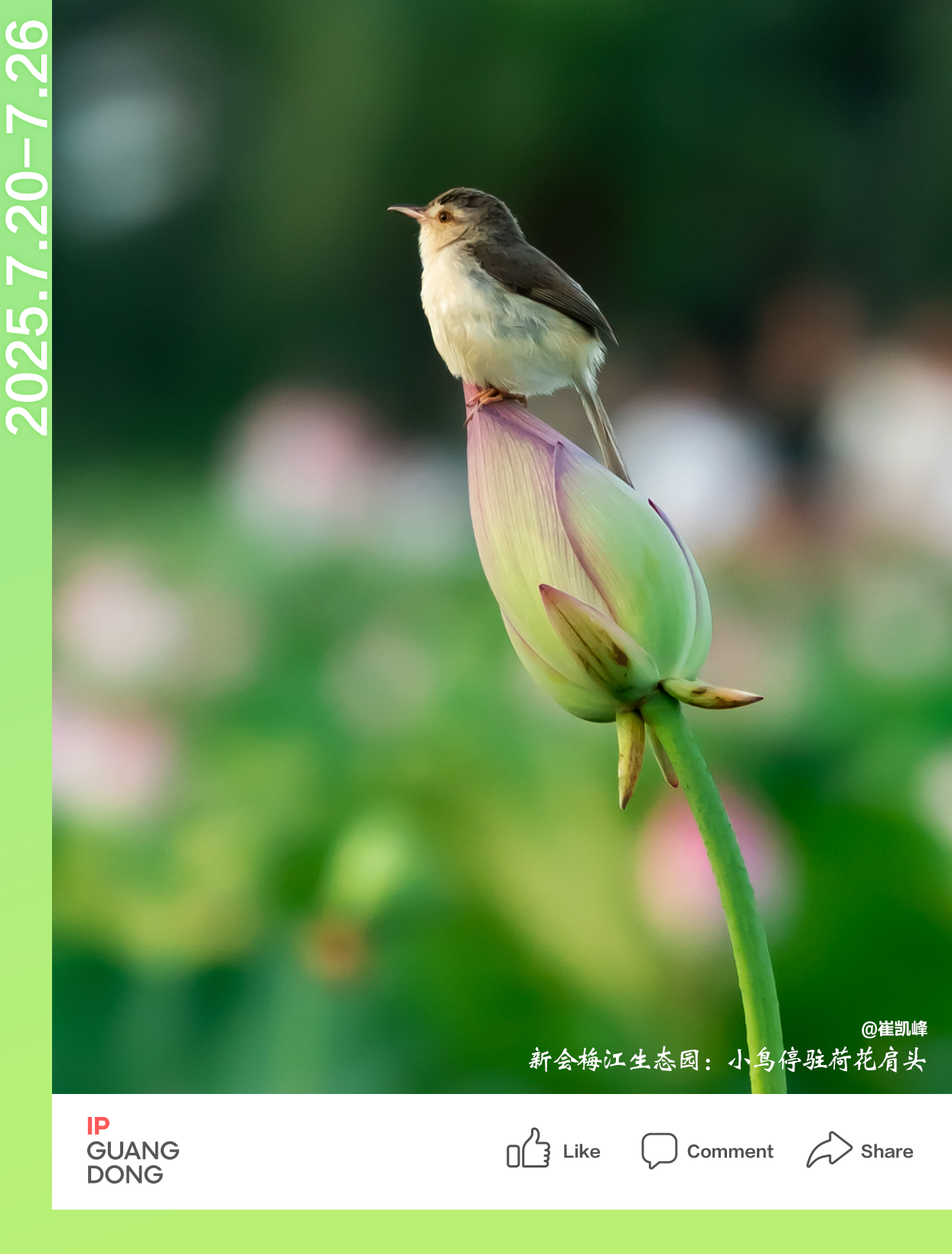 Photographer @Cui Kaifeng focuses his lens on the Meijiang Agricultural Ecological Park in Xinhui, Jiangmen. In the height of summer, lotus flowers are budding, and a small bird perches gracefully on one. The lush greenery spreads, quietly soothing the restless summer heat.