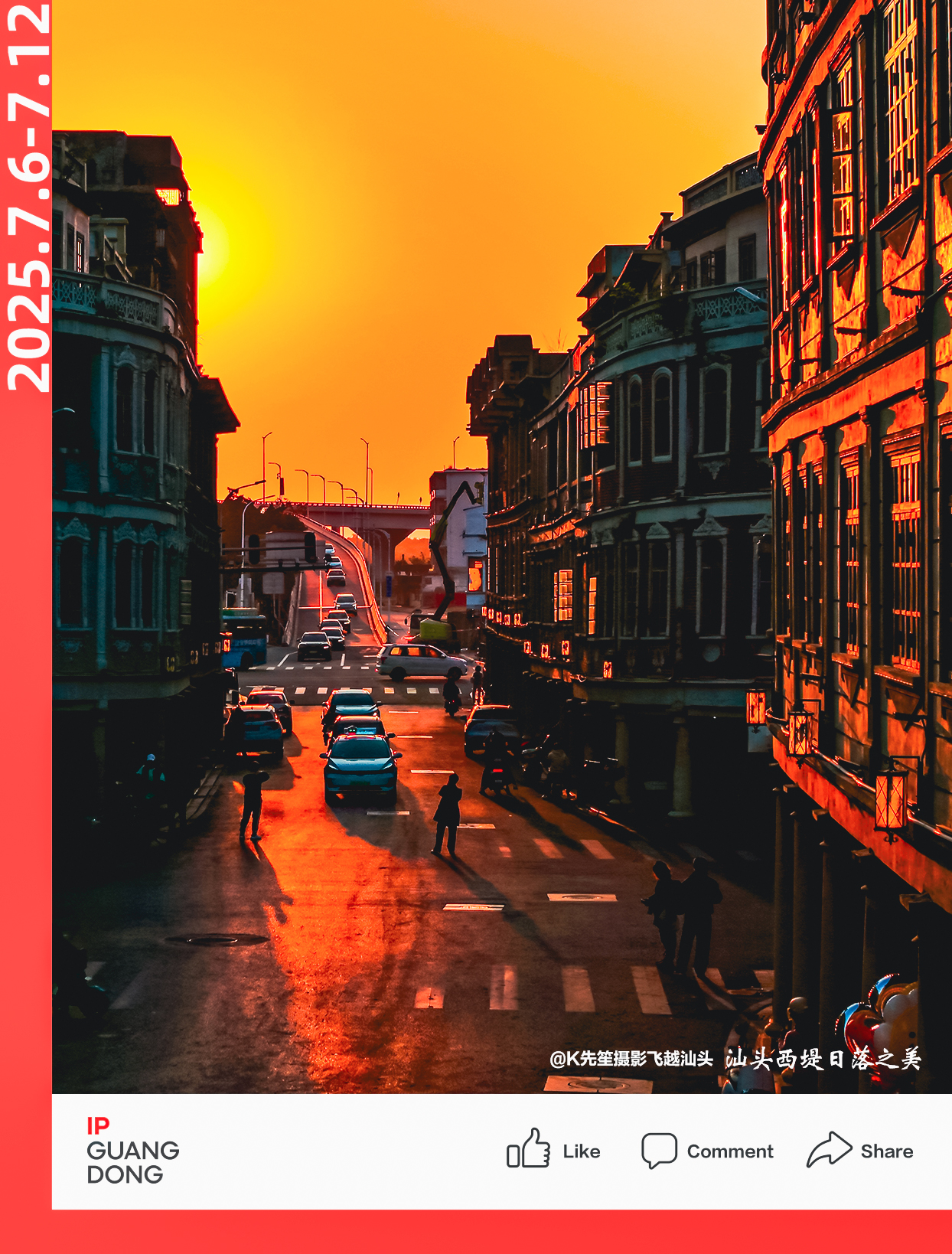 Photographer @Mr. K Photography & Flying over Shantou (@K先笙摄影飞越汕头) captures Shantou's urban landscape as the setting sun drapes the buildings along the port of Xidi (西堤) in golden splendor. Passersby halt their steps, whose shadows stretched long in the lingering glow.