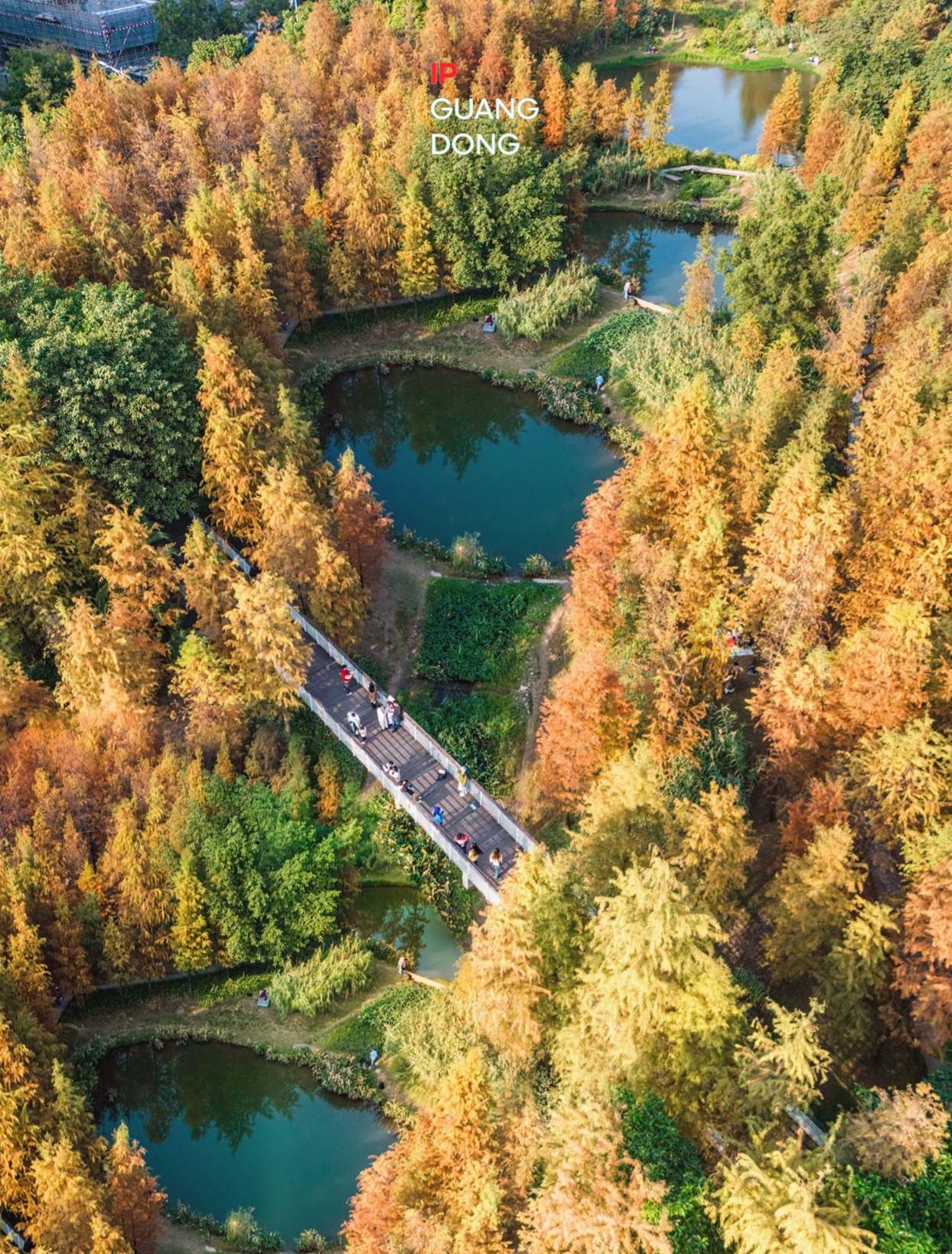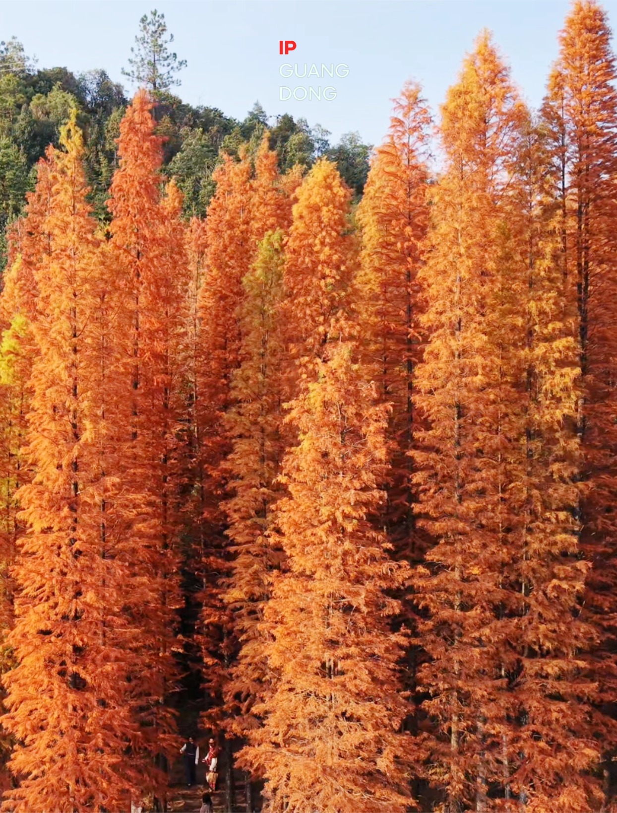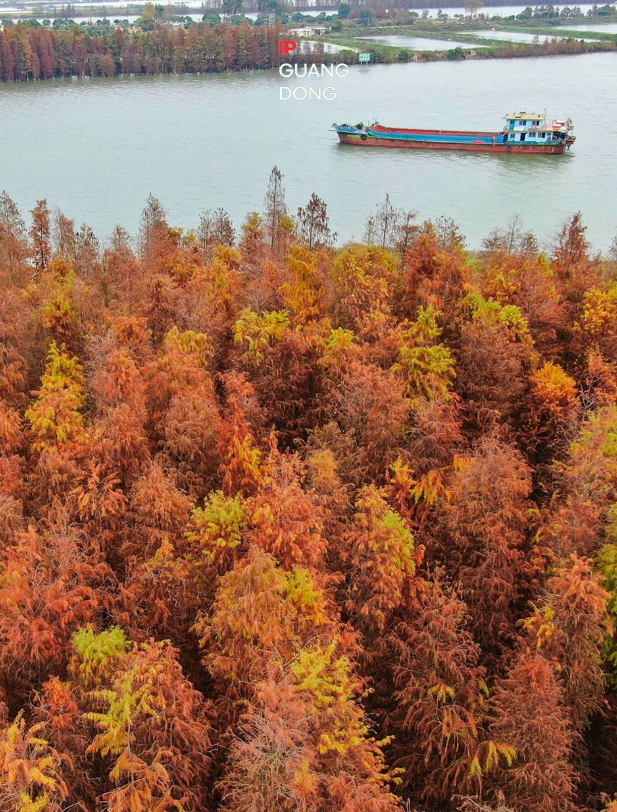In recent days, the bald cypress trees across Guangdong stand tall and straight, their canopies ablaze with layered autumn hues, shining brightly under the sun.