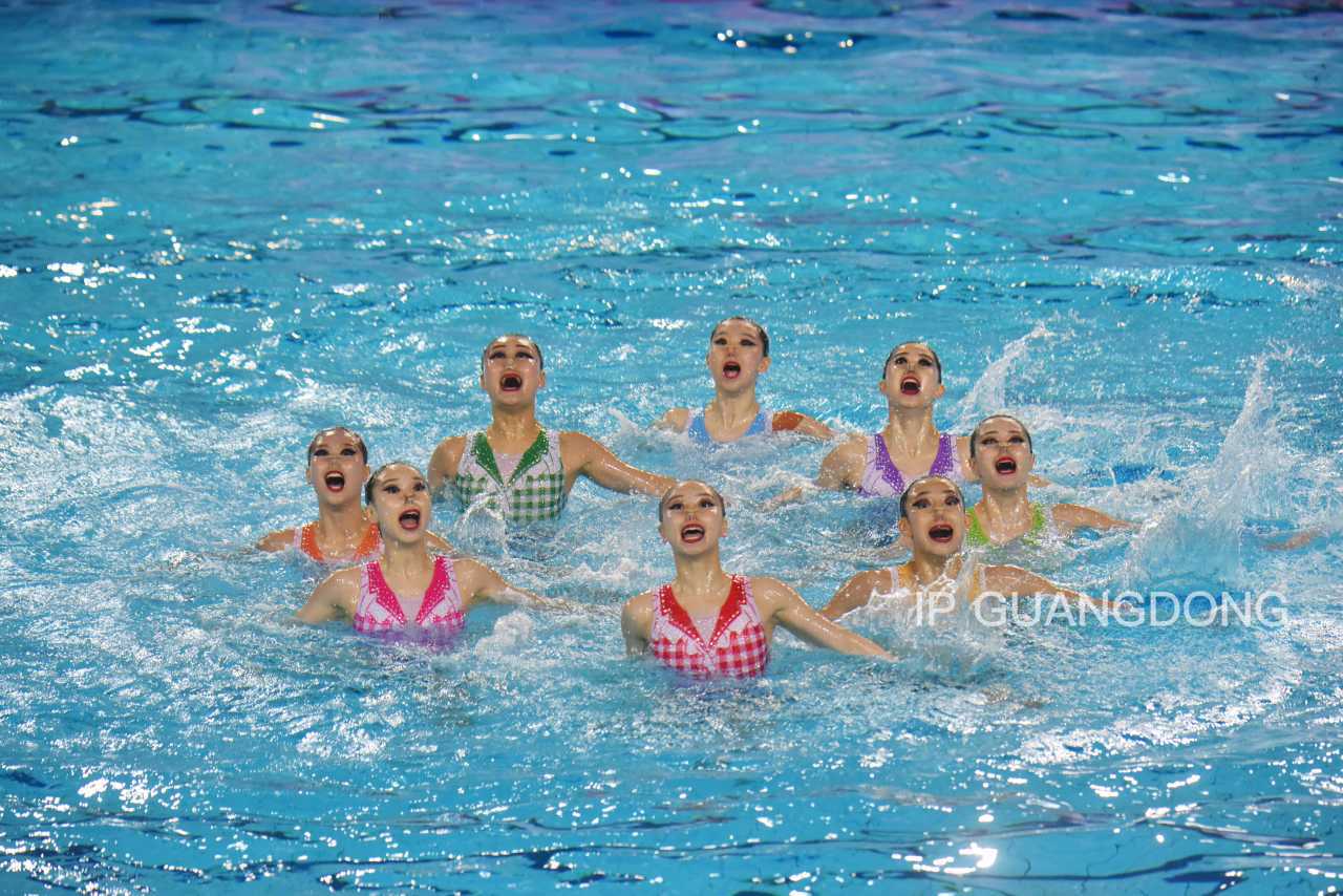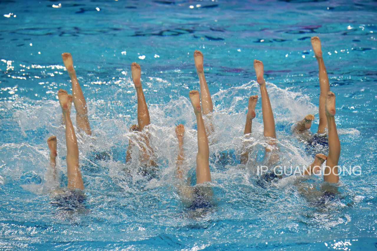 In the synchronized swimming event, these "water sprites" leap into the air in perfect unison, weaving poetry with their bodies in the water.