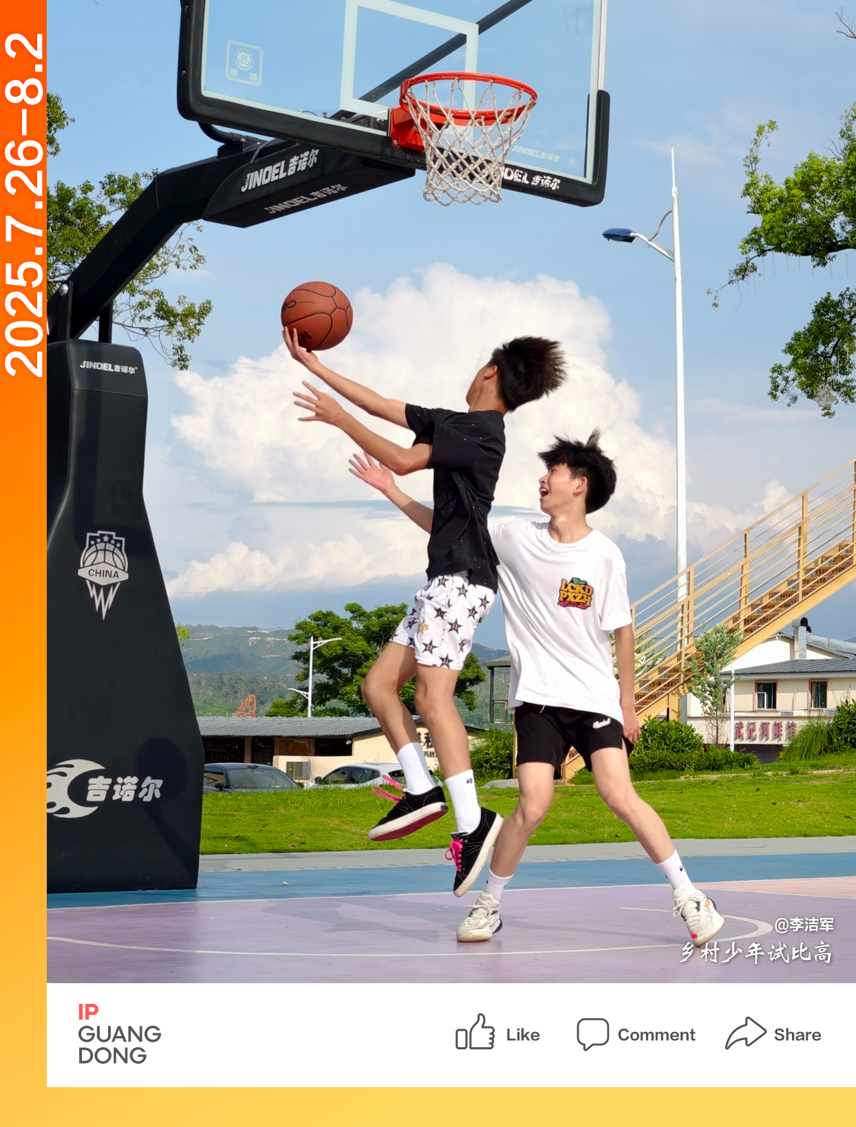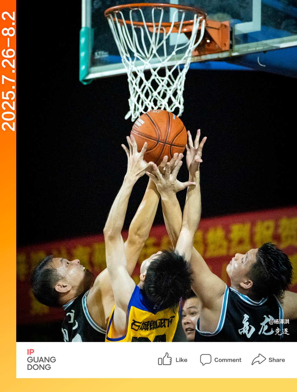 Photographer @Yang Zehong captures the moment on the basketball court in Yunfu City, where athletes from both sides leap high with their arms outstretched, engaging in an intense battle under the basket. In this moment, strength and skill reach their peak confrontation, as the players embody the spirit of sports through their relentless drive.